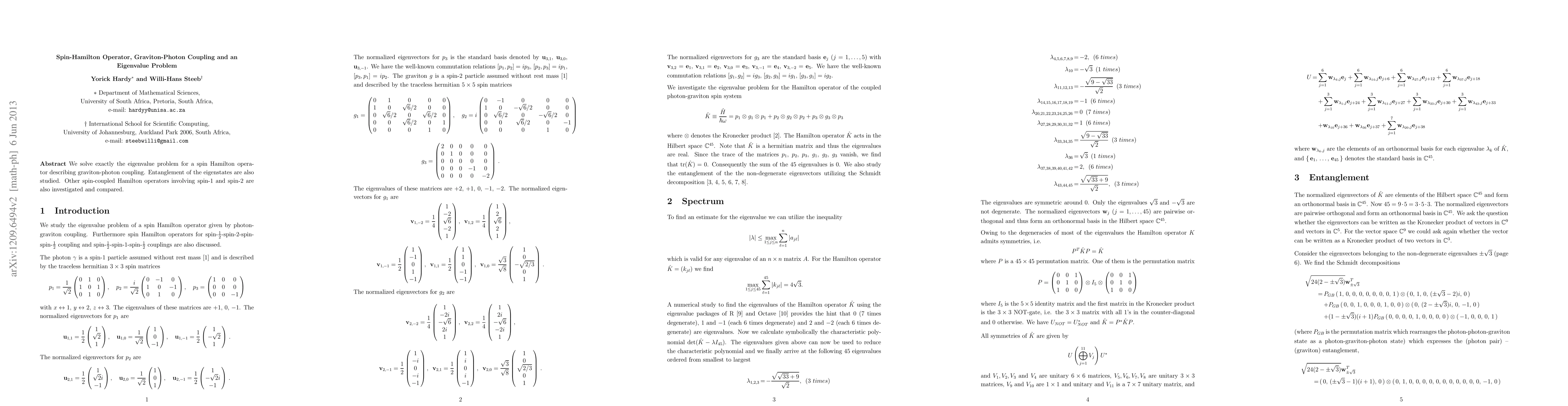 We solve exactly the eigenvalue problem for a spin Hamilton operator describing graviton-photon coupling. Entanglement of the eigenstates are also studied. Other spin-coupled Hamilton operators involving spin-1 and spin-2 are also investigated and compared.