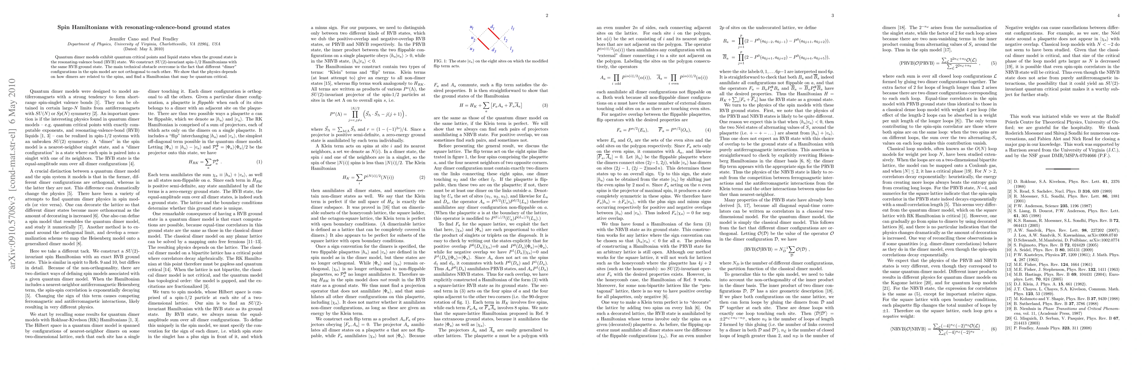 This paper constructs SU(2)-invariant spin-1/2 Hamiltonians that exhibit resonating-valence-bond (RVB) ground states, akin to quantum dimer models. It addresses the challenge of non-orthogonal "dimer" configurations and identifies a Hamiltonian that potentially represents a quantum critical point.