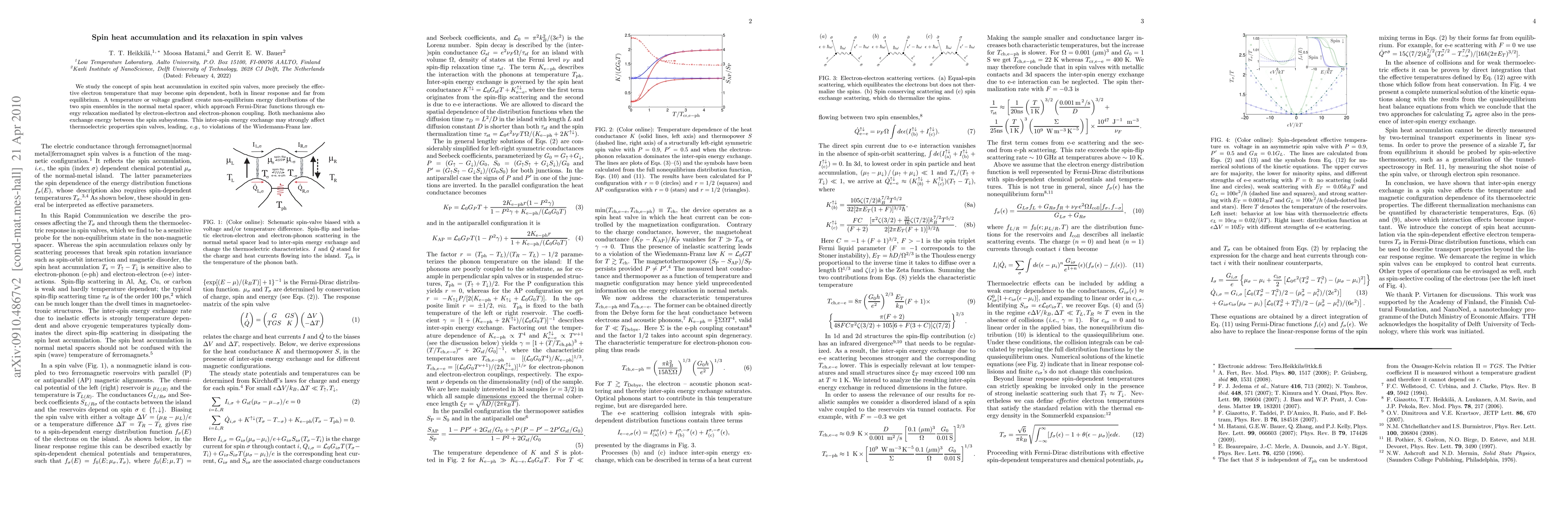 This paper investigates spin heat accumulation in spin valves under non-equilibrium conditions, focusing on the effective electron temperature's spin dependence. It explores how energy relaxation through electron-electron and electron-phonon coupling affects thermoelectric properties, potentially violating the Wiedemann-Franz law.