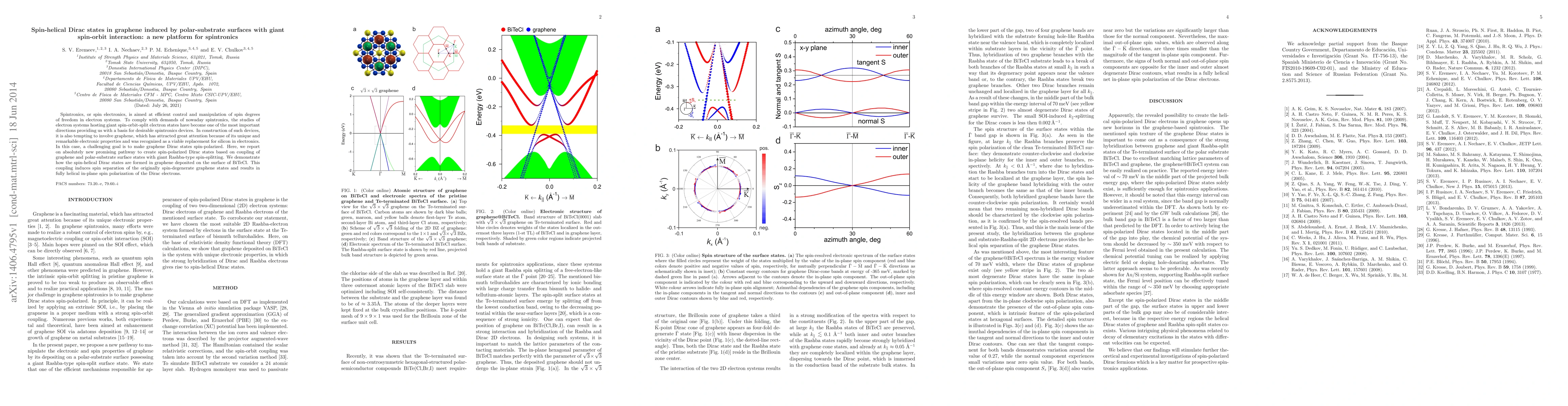 Spintronics, or spin electronics, is aimed at efficient control and manipulation of spin degrees of freedom in electron systems. To comply with demands of nowaday spintronics, the studies of electron systems hosting giant spin-orbit-split electron states have become one of the most important directions providing us with a basis for desirable spintronics devices. In construction of such devices, it is also tempting to involve graphene, which has attracted great attention because of its unique and remarkable electronic properties and was recognized as a viable replacement for silicon in electronics. In this case, a challenging goal is to make graphene Dirac states spin-polarized. Here, we report on absolutely new promising pathway to create spin-polarized Dirac states based on coupling of graphene and polar-substrate surface states with giant Rashba-type spin-splitting. We demonstrate how the spin-helical Dirac states are formed in graphene deposited on the surface of BiTeCl. This coupling induces spin separation of the originally spin-degenerate graphene states and results in fully helical in-plane spin polarization of the Dirac electrons.