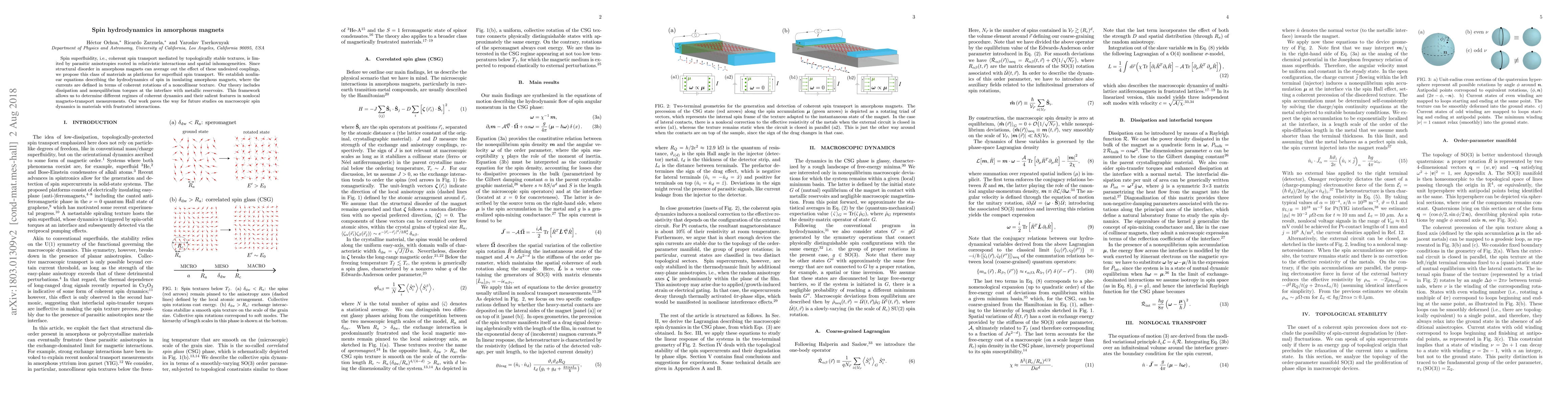 The paper proposes amorphous magnets as platforms for spin superfluidity, establishing nonlinear hydrodynamic equations for spin transport in these materials, and identifies regimes of coherent dynamics in nonlocal magneto-transport measurements, paving the way for future macroscopic spin dynamics studies.