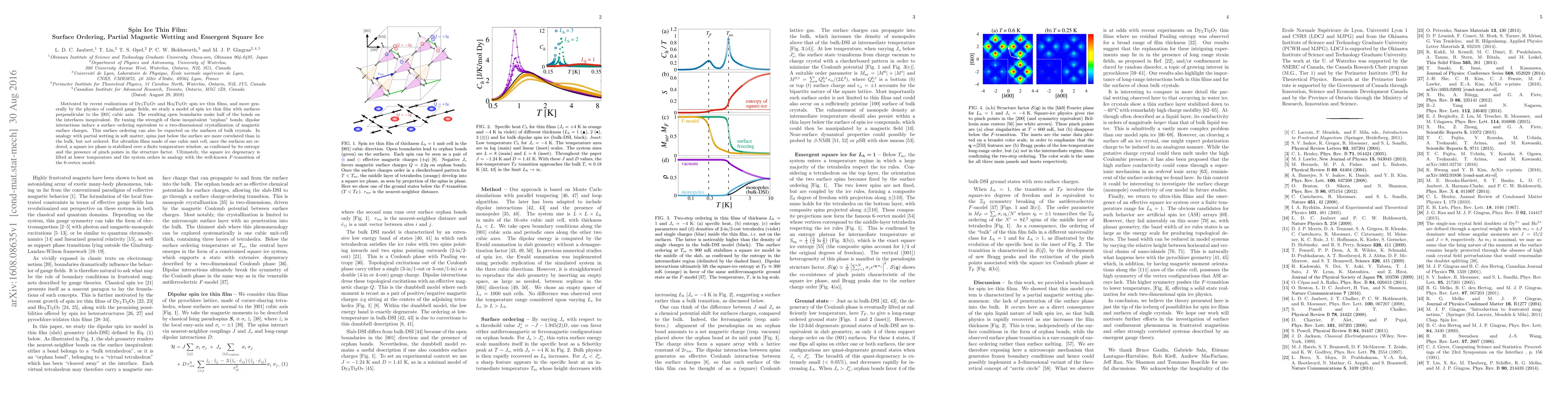 Motivated by recent realizations of Dy$_{2}$Ti$_{2}$O$_{7}$ and Ho$_{2}$Ti$_{2}$O$_{7}$ spin ice thin films, and more generally by the physics of confined gauge fields, we study a model of spin ice thin film with surfaces perpendicular to the $[001]$ cubic axis. The resulting open boundaries make half of the bonds on the interfaces inequivalent. By tuning the strength of these inequivalent "orphan" bonds, dipolar interactions induce a surface ordering equivalent to a two-dimensional crystallization of magnetic surface charges. This surface ordering can also be expected on the surfaces of bulk crystals. In analogy with partial wetting in soft matter, spins just below the surface are more correlated than in the bulk, but \emph{not} ordered. For ultrathin films made of one cubic unit cell, once the surfaces are ordered, a square ice phase is stabilized over a finite temperature window, as confirmed by its entropy and the presence of pinch points in the structure factor. Ultimately, the square ice degeneracy is lifted at lower temperature and the system orders in analogy with the well-known $F$-transition of the $6$-vertex model.