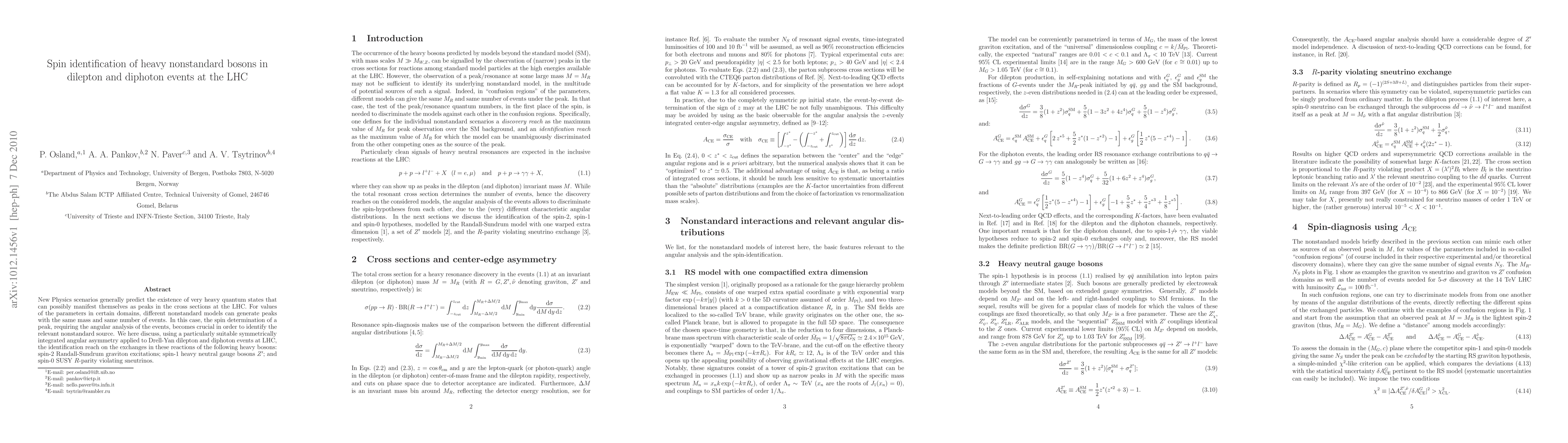 New Physics scenarios generally predict the existence of very heavy quantum states that can possibly manifest themselves as peaks in the cross sections at the LHC. For values of the parameters in certain domains, different nonstandard models can generate peaks with the same mass and same number of events. In this case, the spin determination of a peak, requiring the angular analysis of the events, becomes crucial in order to identify the relevant nonstandard source. We here discuss, using a particularly suitable symmetrically integrated angular asymmetry applied to Drell-Yan dilepton and diphoton events at LHC, the identification reach on the exchanges in these reactions of the following heavy bosons: spin-2 Randall-Sundrum graviton excitations; spin-1 heavy neutral gauge bosons Z^\prime; and spin-0 SUSY R-parity violating sneutrinos.