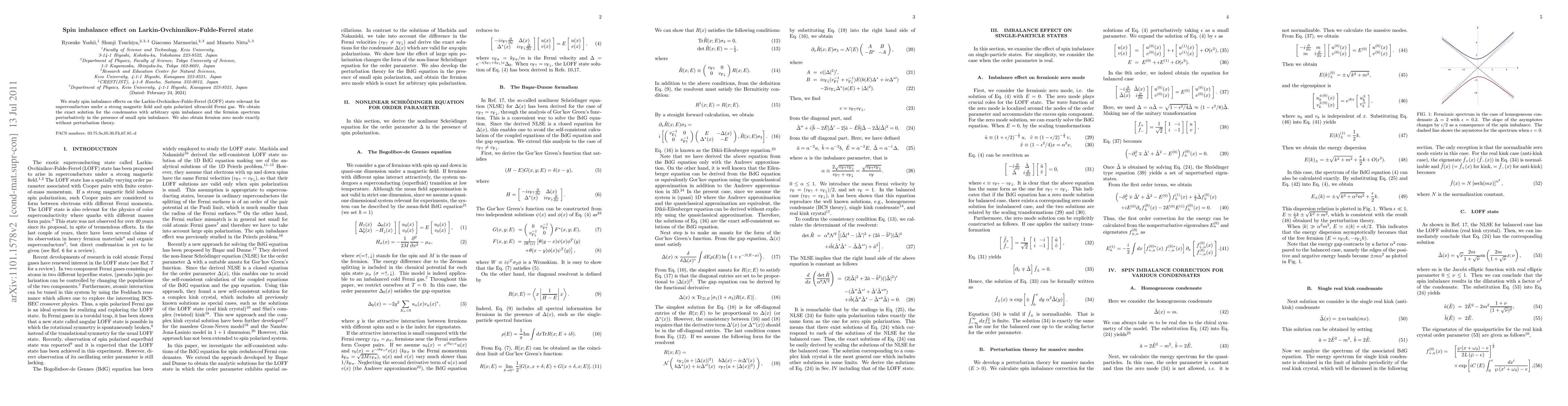 This paper investigates the impact of spin imbalance on the Larkin-Ovchinnikov-Fulde-Ferrel (LOFF) state in superconductors under strong magnetic fields and spin-polarized ultracold Fermi gases. It provides exact solutions for condensates with arbitrary spin imbalance and perturbatively derived fermion spectra for small imbalances, along with the exact determination of fermion zero modes.