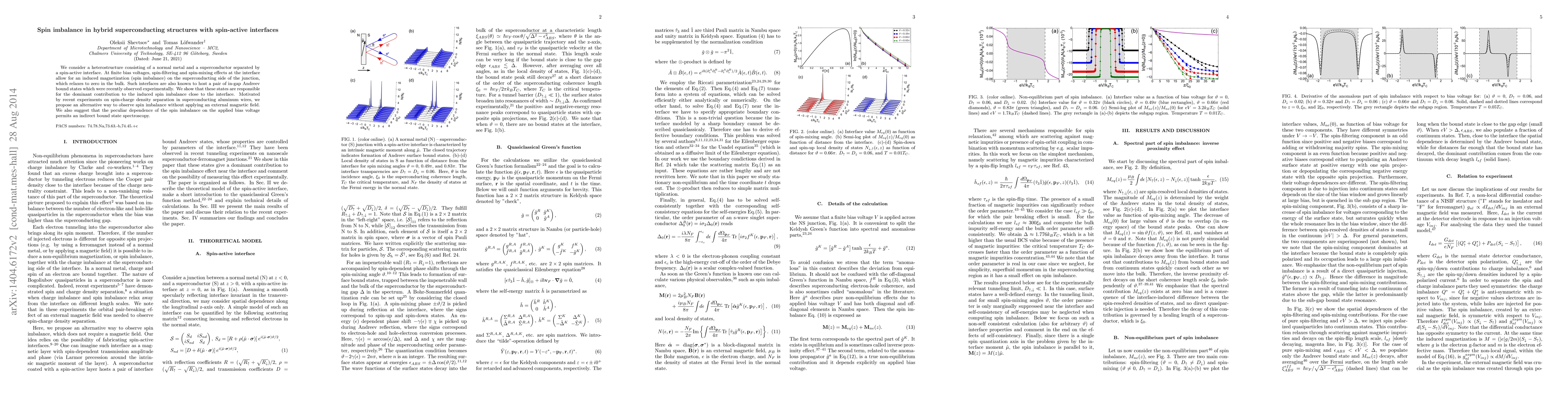This research explores spin imbalance in hybrid superconducting structures with spin-active interfaces, revealing that in-gap Andreev bound states contribute significantly to the spin imbalance near the interface. The study proposes a method to observe this spin imbalance without an external magnetic field, leveraging the dependence of spin imbalance on applied bias voltage for potential indirect bound-state spectroscopy.