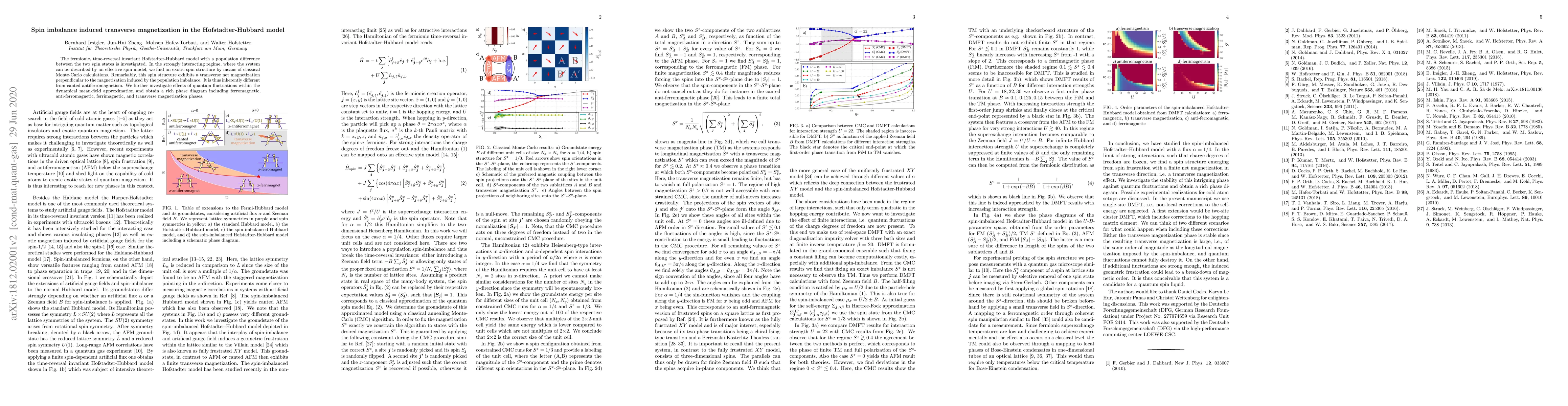 The research investigates the Hofstadter-Hubbard model with spin imbalance, finding an exotic spin structure in the strongly interacting regime with a transverse magnetization perpendicular to the population imbalance magnetization. Utilizing classical Monte-Carlo calculations and dynamical mean-field approximation, a phase diagram with ferromagnetic, antiferromagnetic, ferrimagnetic, and transverse magnetization phases is uncovered.