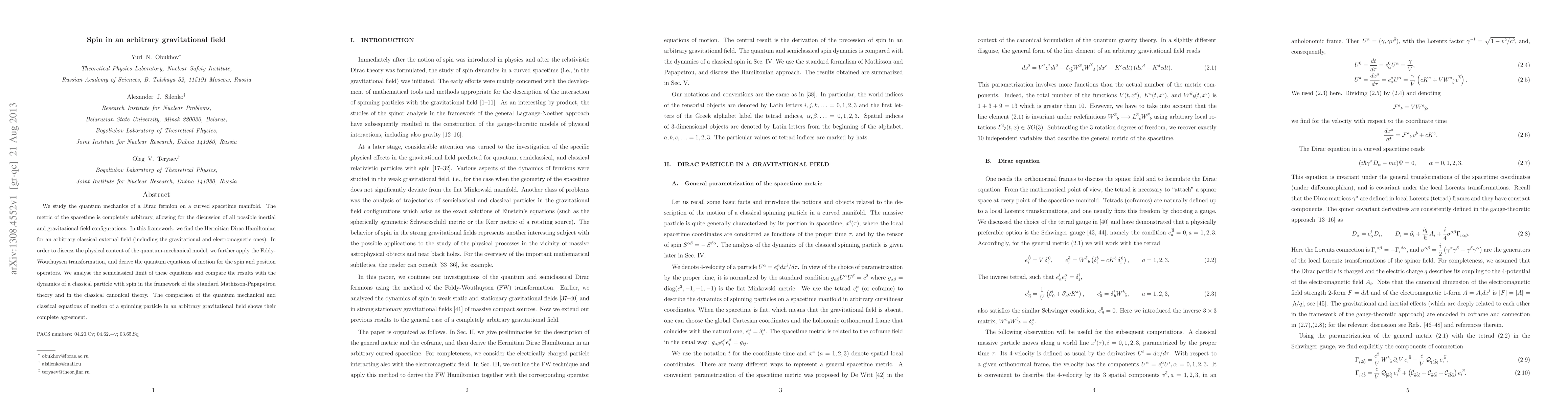 We study the quantum mechanics of a Dirac fermion on a curved spacetime manifold. The metric of the spacetime is completely arbitrary, allowing for the discussion of all possible inertial and gravitational field configurations. In this framework, we find the Hermitian Dirac Hamiltonian for an arbitrary classical external field (including the gravitational and electromagnetic ones). In order to discuss the physical content of the quantum-mechanical model, we further apply the Foldy-Wouthuysen transformation, and derive the quantum equations of motion for the spin and position operators. We analyse the semiclassical limit of these equations and compare the results with the dynamics of a classical particle with spin in the framework of the standard Mathisson-Papapetrou theory and in the classical canonical theory. The comparison of the quantum mechanical and classical equations of motion of a spinning particle in an arbitrary gravitational field shows their complete agreement.
