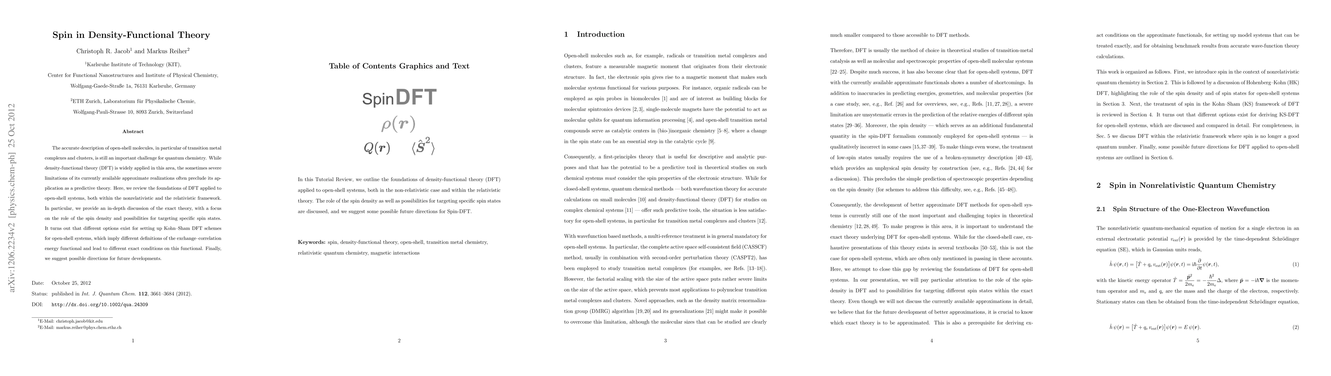 The accurate description of open-shell molecules, in particular of transition metal complexes and clusters, is still an important challenge for quantum chemistry. While density-functional theory (DFT) is widely applied in this area, the sometimes severe limitations of its currently available approximate realizations often preclude its application as a predictive theory. Here, we review the foundations of DFT applied to open-shell systems, both within the nonrelativistic and the relativistic framework. In particular, we provide an in-depth discussion of the exact theory, with a focus on the role of the spin density and possibilities for targeting specific spin states. It turns out that different options exist for setting up Kohn-Sham DFT schemes for open-shell systems, which imply different definitions of the exchange-correlation energy functional and lead to different exact conditions on this functional. Finally, we suggest some possible directions for future developments.