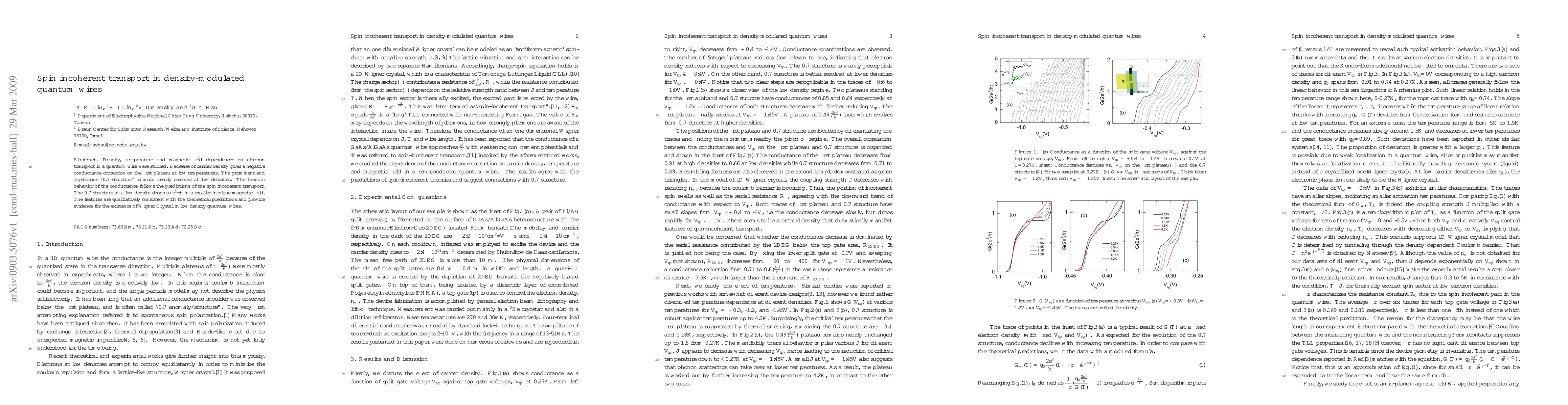 Density, temperature and magnetic field dependences on electron transport in a quantum wire were studied. Decrease of carrier density gives a negative conductance correction on the first plateau at low temperatures. The prominent and mysterious "0.7 structure" is more clearly resolved at low densities. The thermal behavior of the conductance follows the predictions of the spin-incoherent transport. The 0.7 structure at a low density drops to $e^2/h$ in a smaller in-plane magnetic field. The features are qualitatively consistent with the theoretical predictions and provide evidence for the existence of Wigner Crystal in low density quantum wires.
