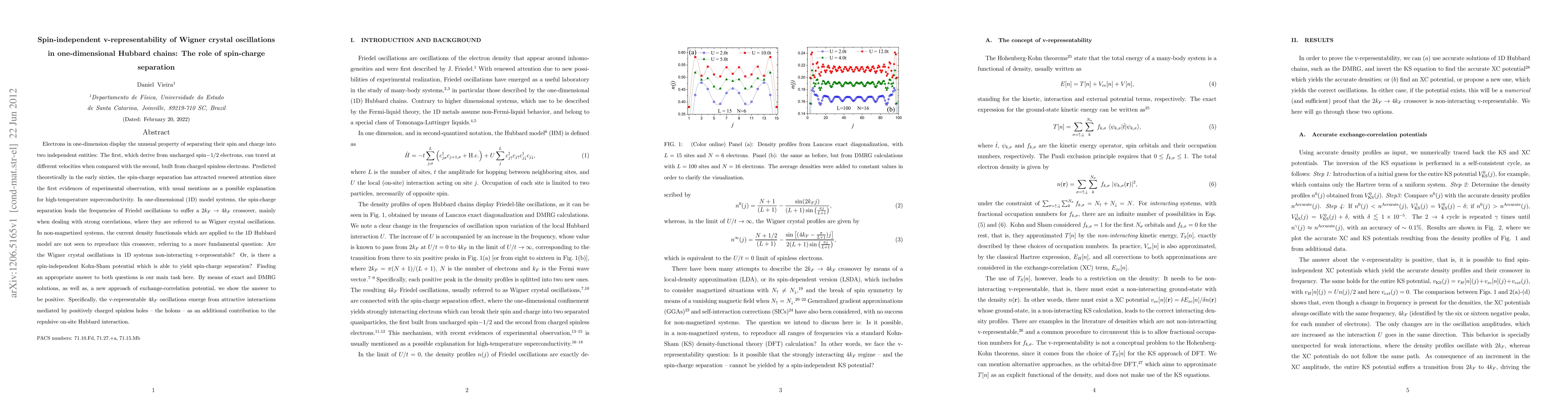 Electrons in one-dimension display the unusual property of separating their spin and charge into two independent entities: The first, which derive from uncharged spin-1/2 electrons, can travel at different velocities when compared with the second, built from charged spinless electrons. Predicted theoretically in the early sixties, the spin-charge separation has attracted renewed attention since the first evidences of experimental observation, with usual mentions as a possible explanation for high-temperature superconductivity. In one-dimensional (1D) model systems, the spin-charge separation leads the frequencies of Friedel oscillations to suffer a 2k_F -- 4k_F crossover, mainly when dealing with strong correlations, where they are referred to as Wigner crystal oscillations. In non-magnetized systems, the current density functionals which are applied to the 1D Hubbard model are not seen to reproduce this crossover, referring to a more fundamental question: Are the Wigner crystal oscillations in 1D systems non-interacting v-representable? Or, is there a spin-independent Kohn-Sham potential which is able to yield spin-charge separation? Finding an appropriate answer to both questions is our main task here. By means of exact and DMRG solutions, as well as, a new approach of exchange-correlation potential, we show the answer to be positive. Specifically, the v-representable 4k_F oscillations emerge from attractive interactions mediated by positively charged spinless holes -- the holons -- as an additional contribution to the repulsive on-site Hubbard interaction.