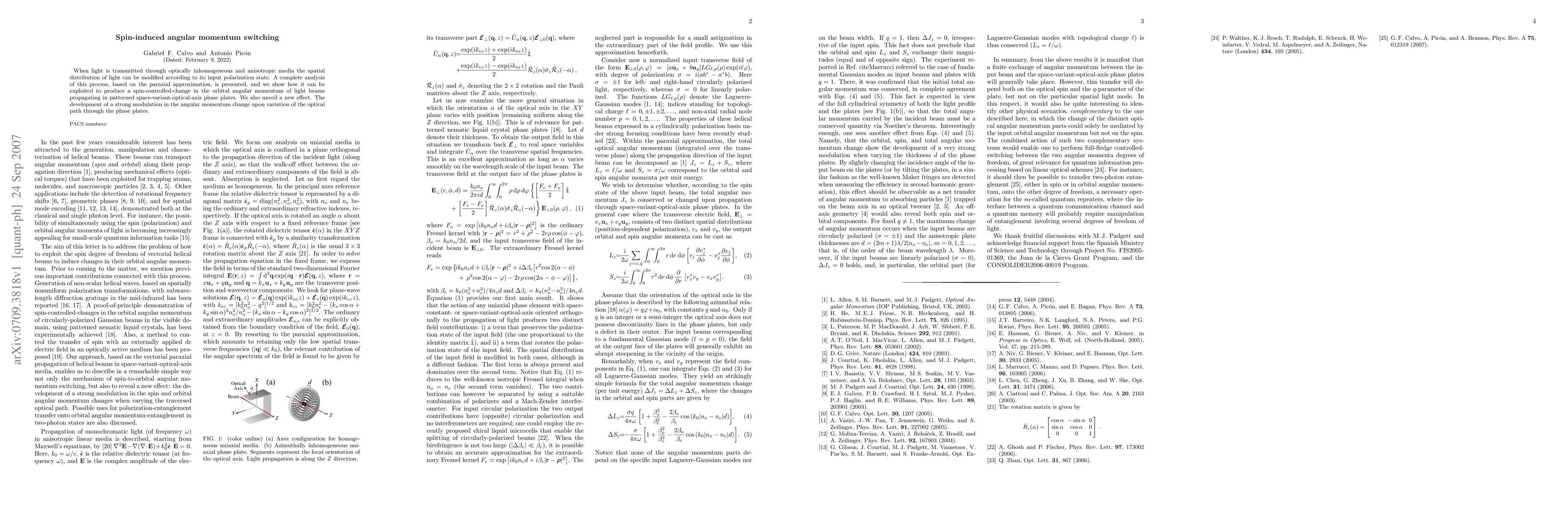 When light is transmitted through optically inhomogeneous and anisotropic media the spatial distribution of light can be modified according to its input polarization state. A complete analysis of this process, based on the paraxial approximation, is presented, and we show how it can be exploited to produce a spin-controlled-change in the orbital angular momentum of light beams propagating in patterned space-variant-optical-axis phase plates. We also unveil a new effect. The development of a strong modulation in the angular momentum change upon variation of the optical path through the phase plates.
