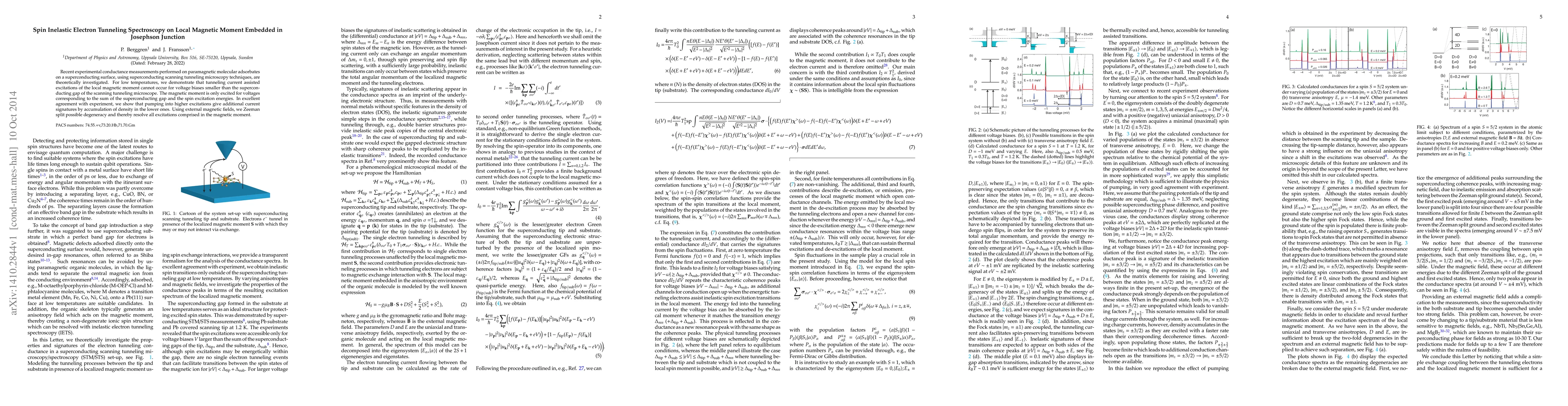 The research investigates tunneling current assisted excitations of a local magnetic moment in a Josephson junction at low temperatures. It shows that the magnetic moment can only be excited for voltages corresponding to its energy levels.