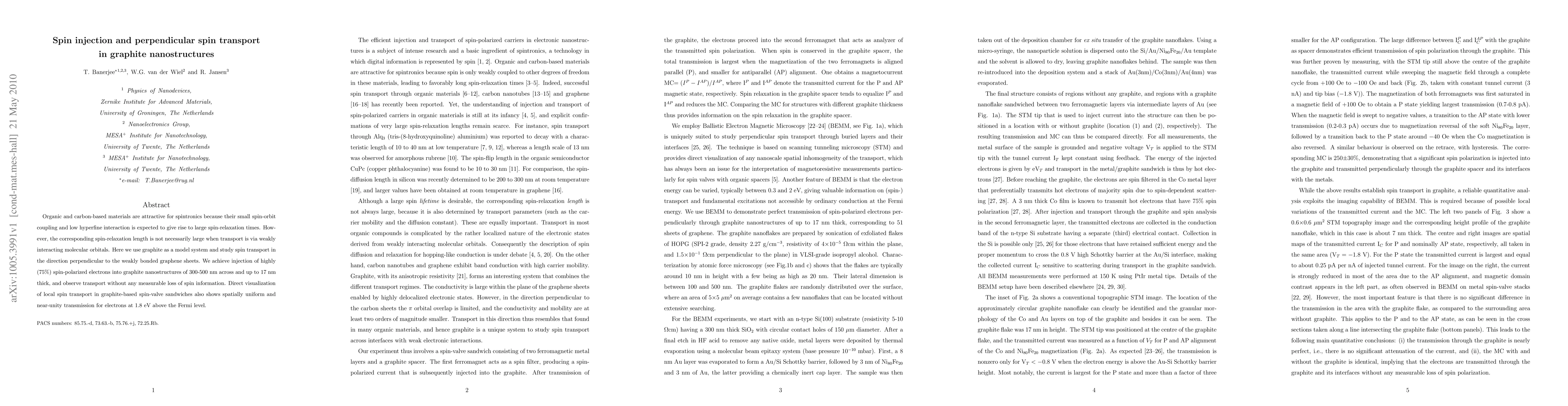This paper investigates spin injection and perpendicular spin transport in graphite nanostructures, achieving 75% spin-polarized electron injection and observing no measurable loss of spin information, demonstrating spatially uniform and near-unity transmission in graphite-based spin-valve sandwiches.