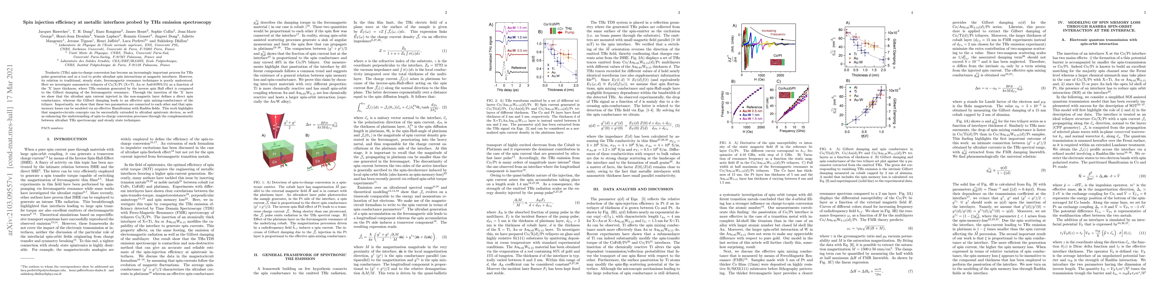 This paper investigates the spin injection efficiency at metallic interfaces using THz emission spectroscopy, demonstrating that ultrafast spin current injection correlates with Gilbert damping and spin-memory losses. The study of Co/X/Pt trilayers reveals a direct spin conductance and effective spin mixing-conductance, highlighting the interplay between ultrafast and steady-state techniques in understanding spin-to-charge conversion.