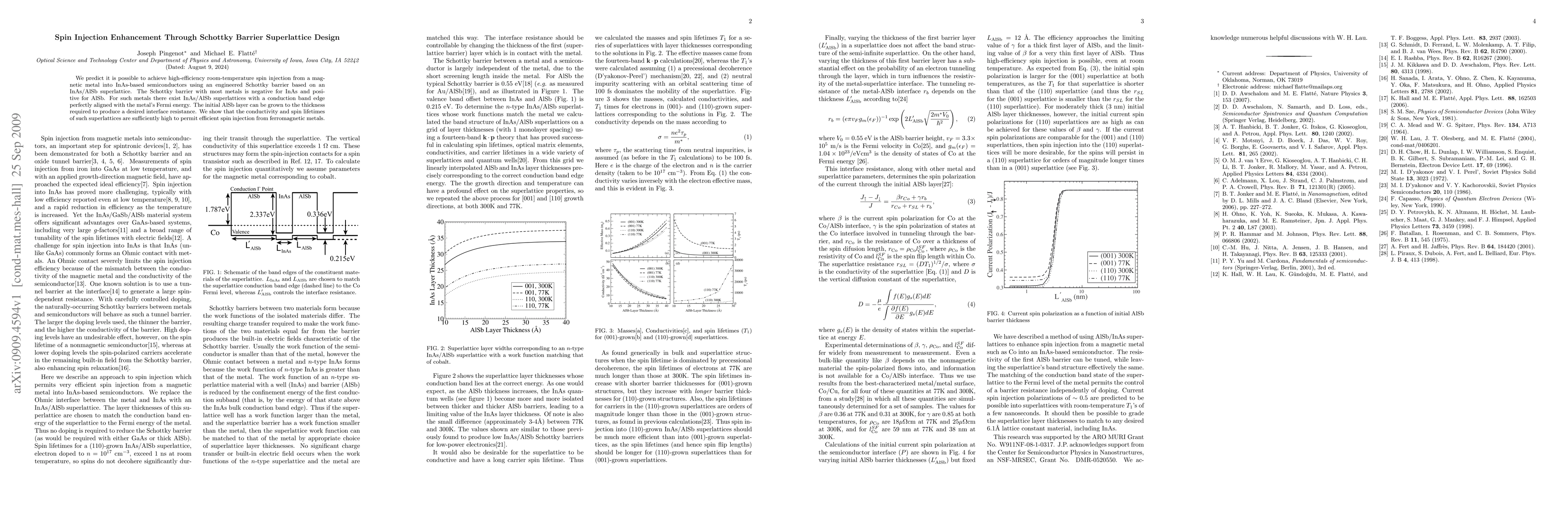 This paper proposes a method to enhance spin injection efficiency at room temperature by designing an InAs/AlSb superlattice Schottky barrier, which aligns the conduction band edge with the metal's Fermi energy, achieving high conductivity and spin lifetimes for effective spin injection from magnetic metals.