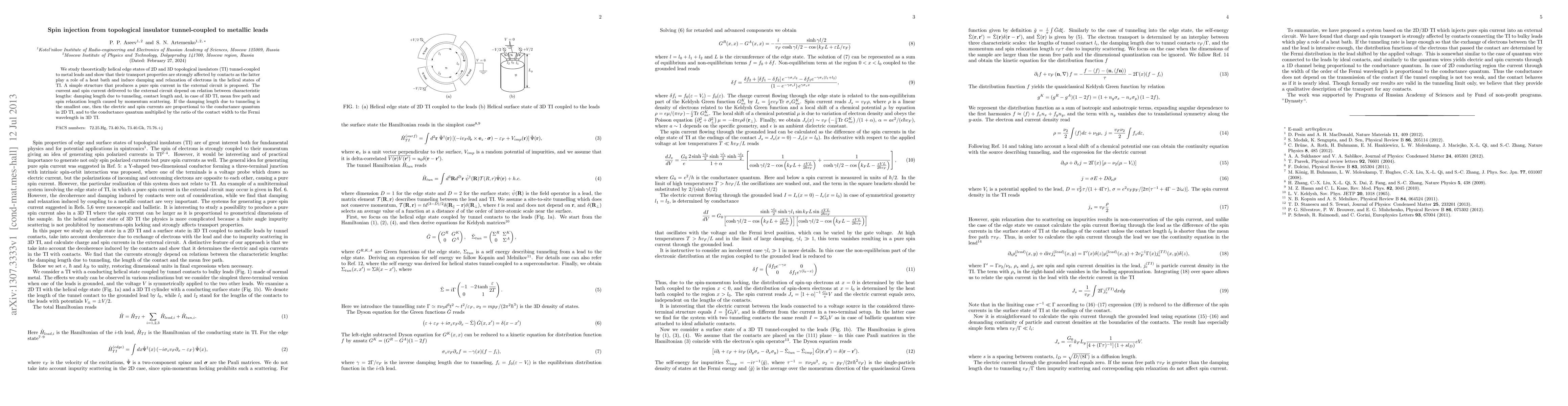 We study theoretically helical edge states of 2D and 3D topological insulators (TI) tunnel-coupled to metal leads and show that their transport properties are strongly affected by contacts as the latter play a role of a heat bath and induce damping and relaxation of electrons in the helical states of TI. A simple structure that produces a pure spin current in the external circuit is proposed. The current and spin current delivered to the external circuit depend on relation between characteristic lengths: damping length due to tunneling, contact length and, in case of 3D TI, mean free path and spin relaxation length caused by momentum scattering. If the damping length due to tunneling is the smallest one, then the electric and spin currents are proportional to the conductance quantum in 2D TI, and to the conductance quantum multiplied by the ratio of the contact width to the Fermi wavelength in 3D TI.