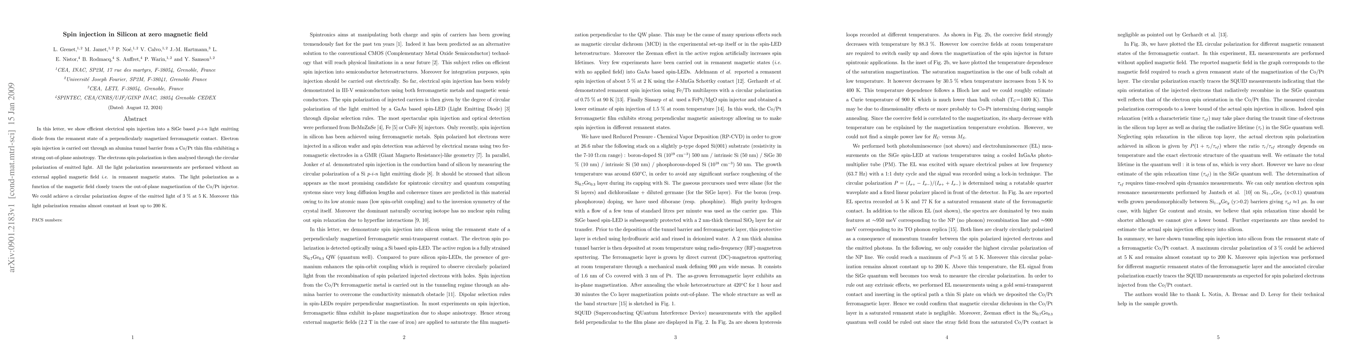 This paper demonstrates efficient electrical spin injection into a SiGe-based p-i-n LED from the remanent state of a magnetized ferromagnetic contact, achieving a circular polarization degree of 3% at 5 K, which remains stable up to 200 K without an external magnetic field.