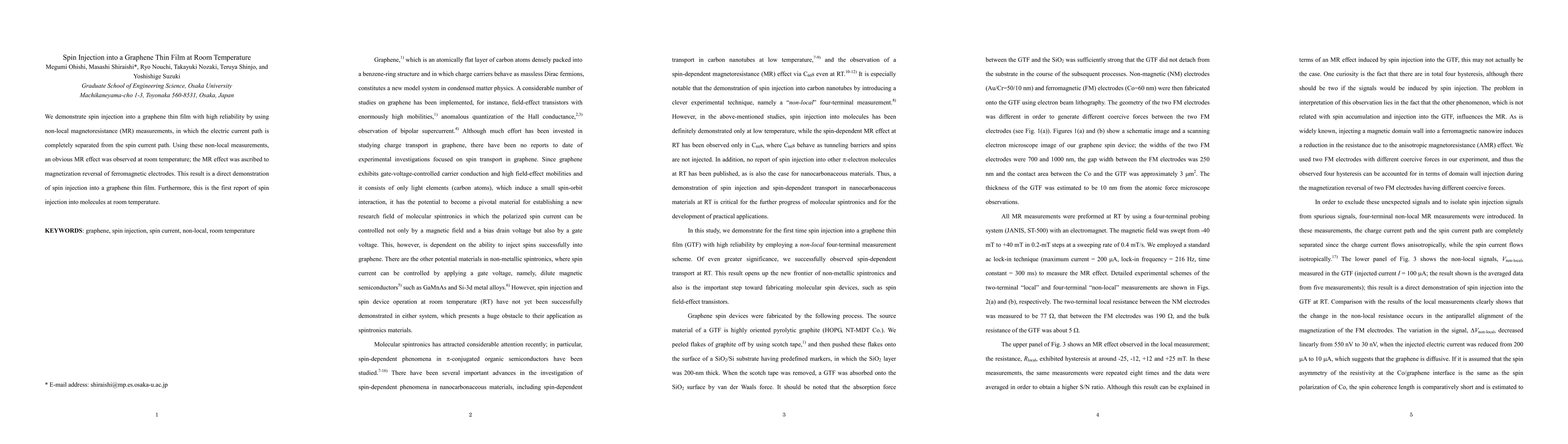 This study successfully demonstrates reliable spin injection into a graphene thin film at room temperature using non-local magnetoresistance measurements, revealing a clear MR effect due to magnetization reversal of ferromagnetic electrodes. This marks the first instance of spin injection into molecules at room temperature.