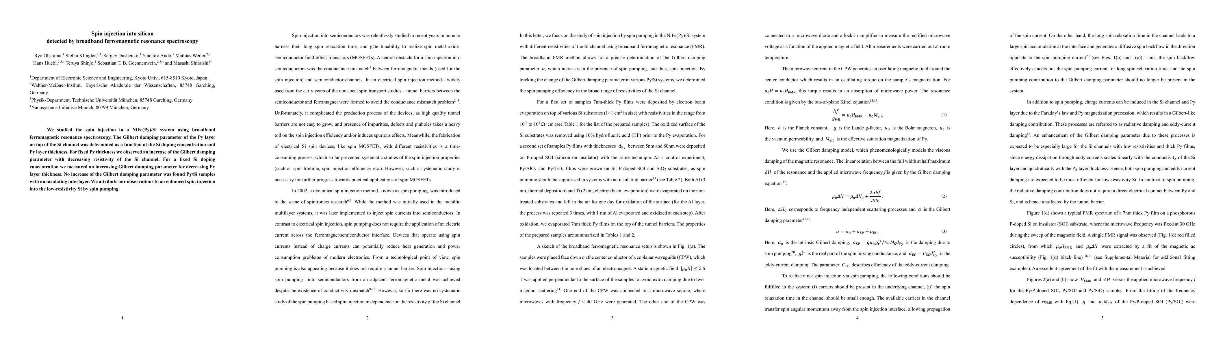 We studied the spin injection in a NiFe(Py)/Si system using broadband ferromagnetic resonance spectroscopy. The Gilbert damping parameter of the Py layer on top of the Si channel was determined as a function of the Si doping concentration and Py layer thickness. For fixed Py thickness we observed an increase of the Gilbert damping parameter with decreasing resistivity of the Si channel. For a fixed Si doping concentration we measured an increasing Gilbert damping parameter for decreasing Py layer thickness. No increase of the Gilbert damping parameter was found Py/Si samples with an insulating interlayer. We attribute our observations to an enhanced spin injection into the low-resistivity Si by spin pumping.