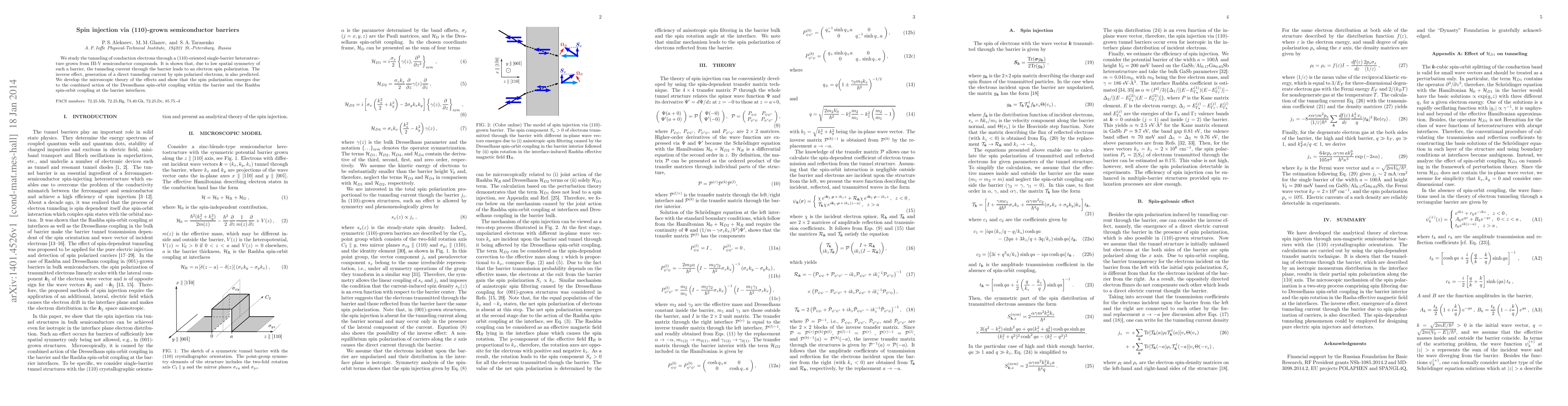 This paper investigates electron tunneling through (110)-oriented semiconductor barriers, demonstrating that the low spatial symmetry results in spin polarization due to Dresselhaus and Rashba spin-orbit couplings. It also predicts the generation of a tunneling current by spin-polarized electrons.