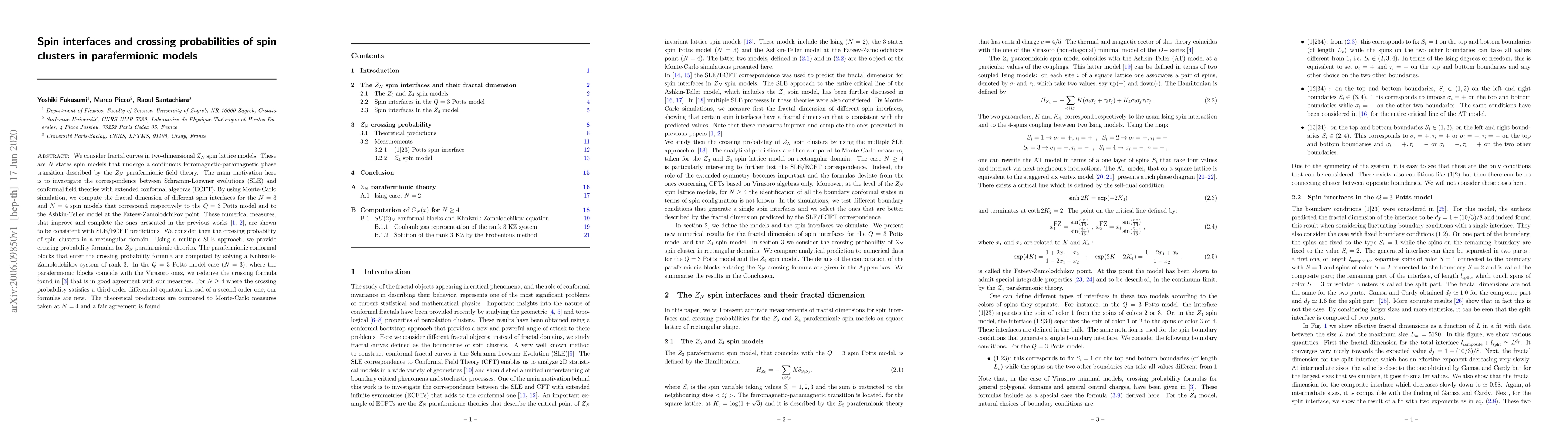 This research paper investigates spin interfaces and crossing probabilities of spin clusters in parafermionic models, using Monte-Carlo simulation to compute fractal dimensions and derive new formulas for crossing probabilities that agree with theoretical predictions.