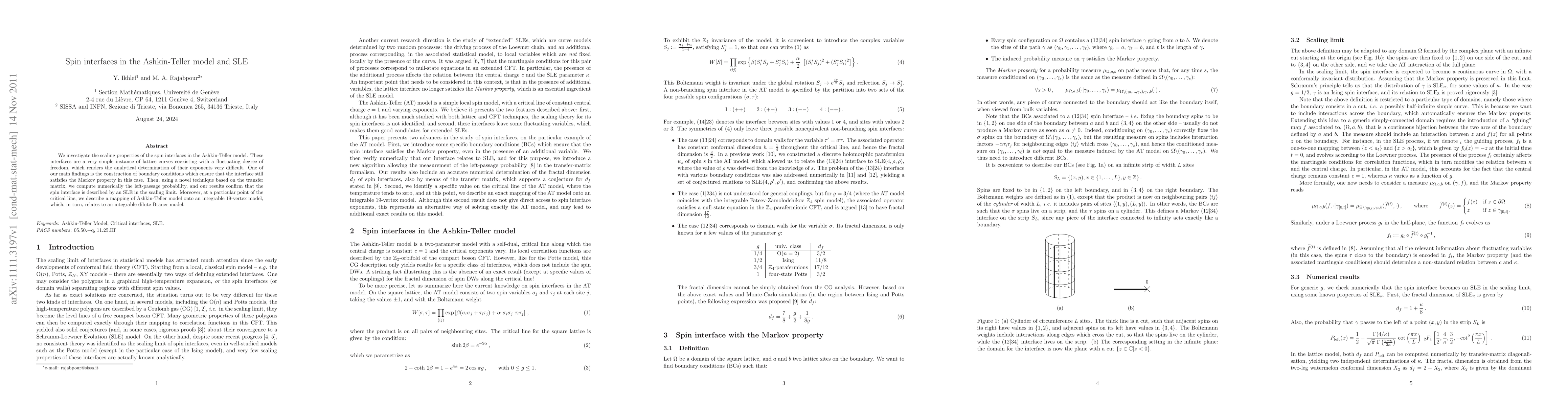 We investigate the scaling properties of the spin interfaces in the Ashkin-Teller model. These interfaces are a very simple instance of lattice curves coexisting with a fluctuating degree of freedom, which renders the analytical determination of their exponents very difficult. One of our main findings is the construction of boundary conditions which ensure that the interface still satisfies the Markov property in this case. Then, using a novel technique based on the transfer matrix, we compute numerically the left-passage probability, and our results confirm that the spin interface is described by an SLE in the scaling limit. Moreover, at a particular point of the critical line, we describe a mapping of Ashkin-Teller model onto an integrable 19-vertex model, which, in turn, relates to an integrable dilute Brauer model.