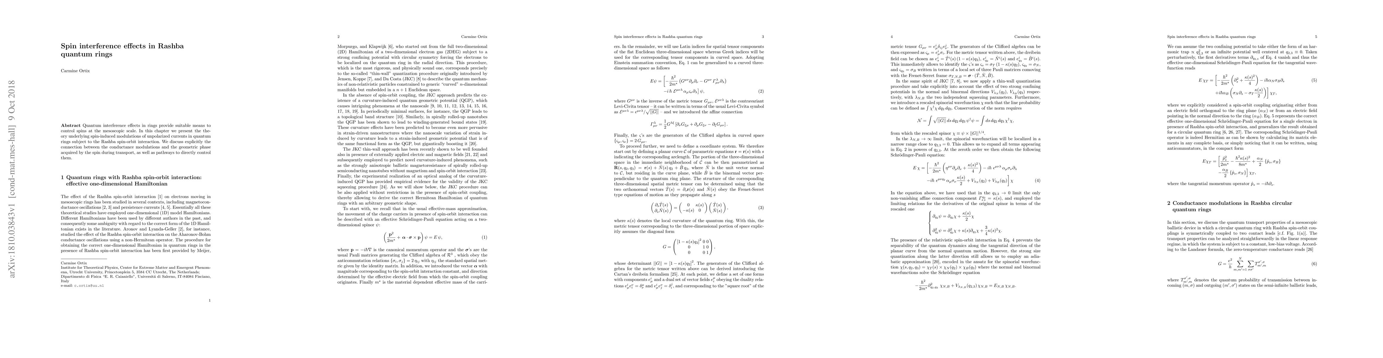 Quantum interference effects in rings provide suitable means to control spins at the mesoscopic scale. In this chapter we present the theory underlying spin-induced modulations of unpolarized currents in quantum rings subject to the Rashba spin-orbit interaction. We discuss explicitly the connection between the conductance modulations and the geometric phase acquired by the spin during transport, as well as pathways to directly control them.