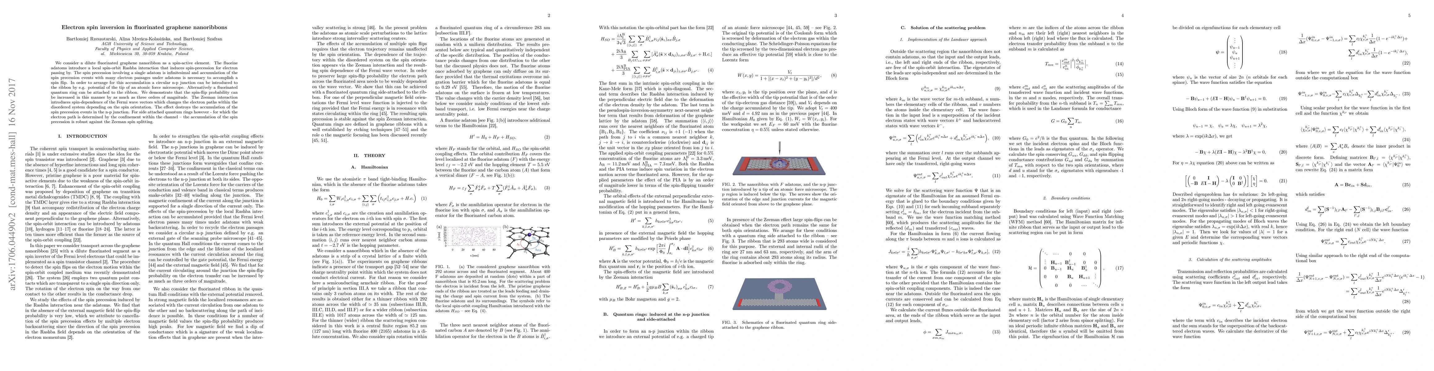 We consider a dilute fluorinated graphene nanoribbon as a spin-active element. The fluorine adatoms introduce a local spin-orbit Rashba interaction that induces spin-precession for electron passing by. In the absence of the external magnetic field the transport is dominated by multiple scattering by adatoms which cancels the spin precession effects, since the direction of the spin precession depends on the electron momentum. Accumulation of the spin precession effects is possible provided that the Fermi level electron passes many times near the same adatom with the same momentum. In order to arrange for these conditions a circular n-p junction can be introduced to the ribbon by e.g. potential of the tip of an atomic force microscope. In the quantum Hall conditions the electron current gets confined along the junction. The electron spin interaction with the local Rashba field changes with the lifetime of the quasi-bound states that is controlled with the coupling of the junction to the edge of the ribbon. We demonstrate that the spin-flip probability can be increased in this manner by as much as three orders of magnitude.