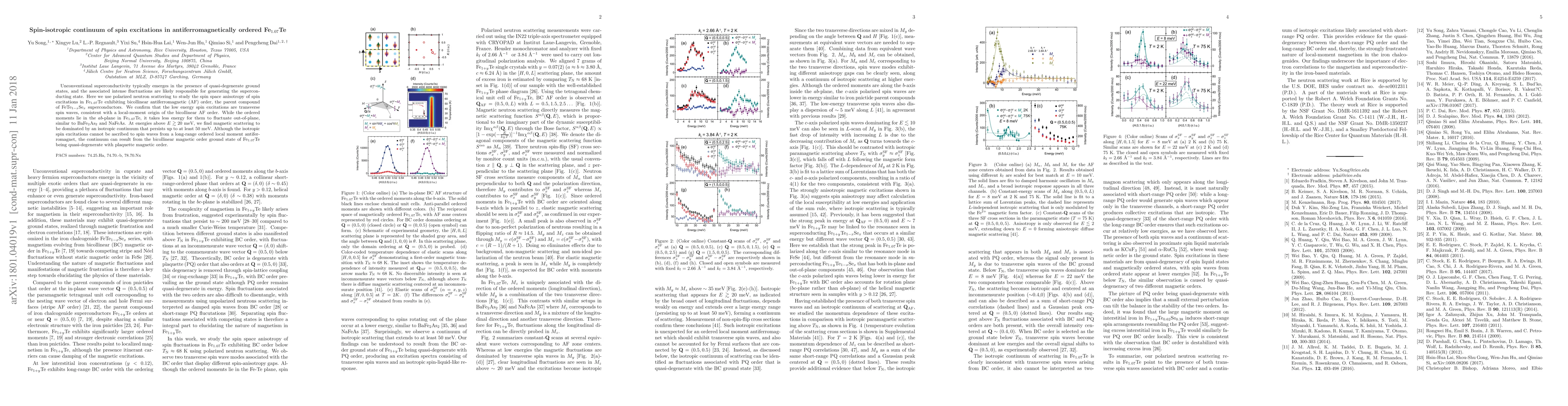 Researchers studied spin excitations in Fe$_{1.07}$Te, a superconducting material, using polarized neutron scattering and found an isotropic continuum of spin excitations above 20 meV, suggesting the material's ground state is quasi-degenerate with another magnetic order.