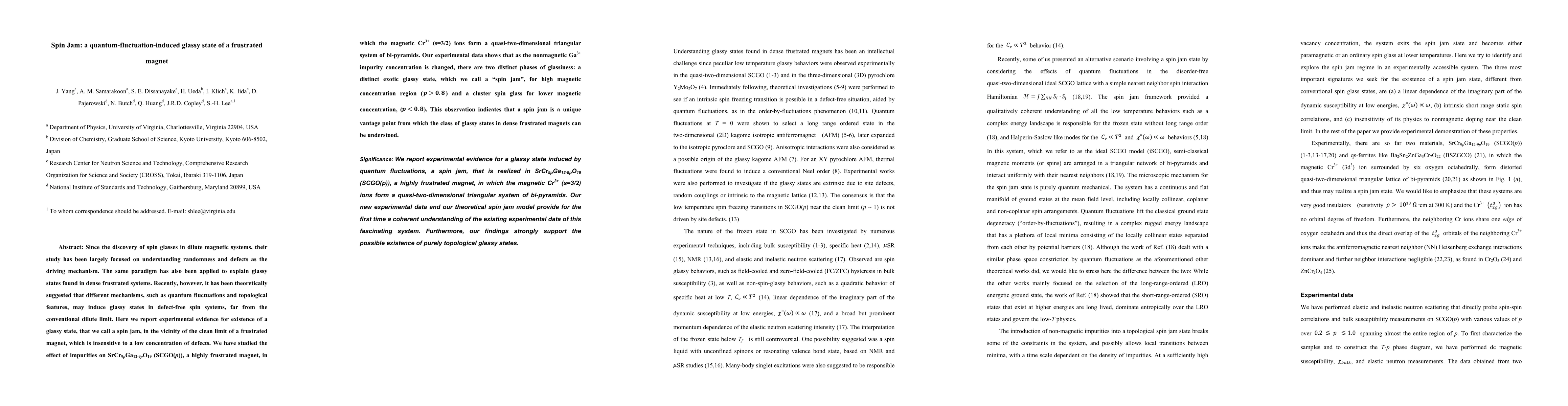 This paper reports experimental evidence for a novel glassy state, termed "spin jam," in a frustrated magnet, induced by quantum fluctuations rather than defects. The study of SrCr9pGa12-9pO19 (SCGO(p)) reveals two distinct glassy phases depending on the concentration of nonmagnetic Ga3+ impurities, indicating a unique understanding of glassy states in dense frustrated systems.