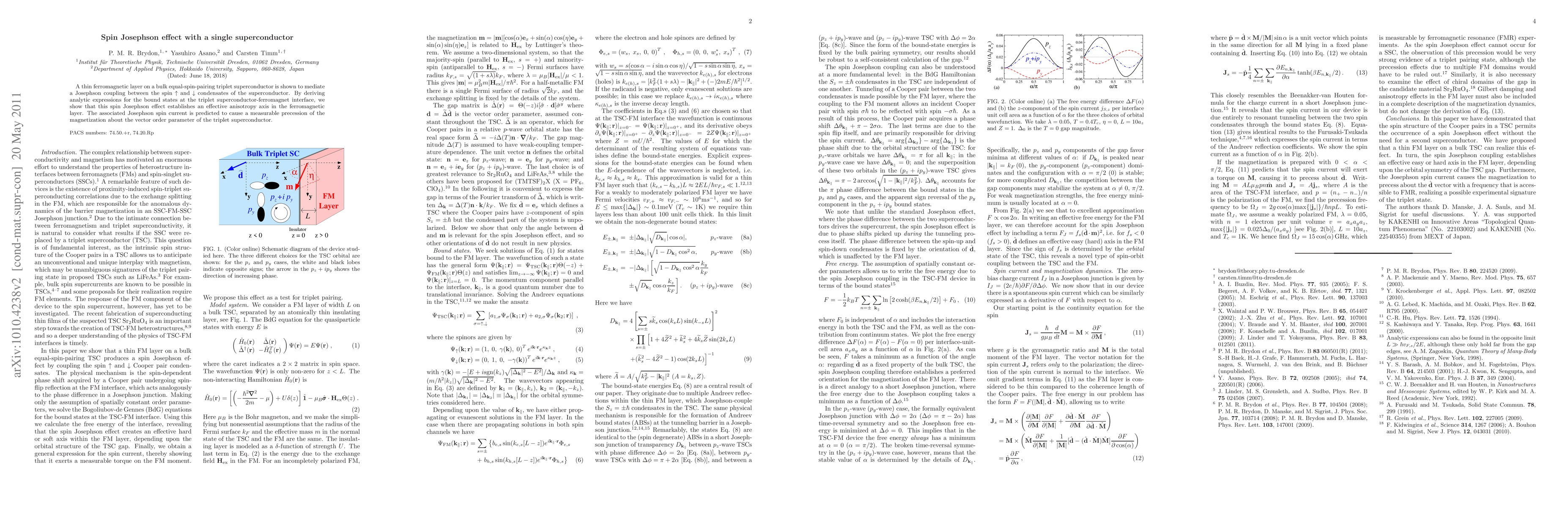 A thin ferromagnetic layer on a bulk equal-spin-pairing triplet superconductor is shown to mediate a Josephson coupling between the spin $\uparrow$ and $\downarrow$ condensates of the superconductor. By deriving analytic expressions for the bound states at the triplet superconductor-ferromagnet interface, we show that this spin Josephson effect establishes an effective anisotropy axis in the ferromagnetic layer. The associated Josephson spin current is predicted to cause a measurable precession of the magnetization about the vector order parameter of the triplet superconductor.