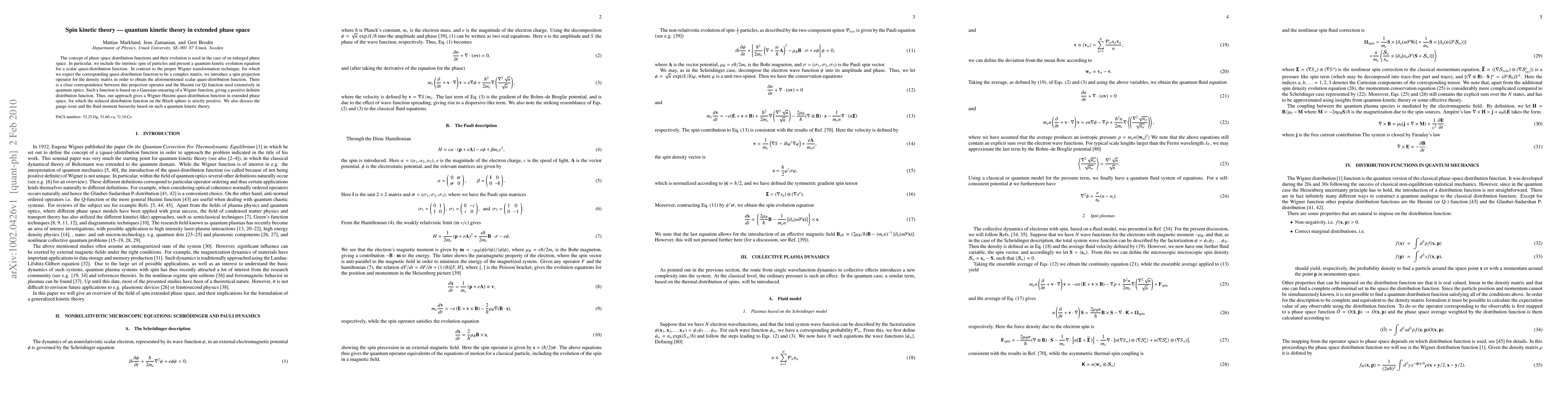 Researchers introduce a quantum kinetic theory in extended phase space that includes particle spin, resulting in a Wigner-Husimi quasi-distribution function with strictly positive reduced distribution on the Bloch sphere. This approach resolves gauge issues and provides a framework for fluid moment hierarchy in quantum systems.