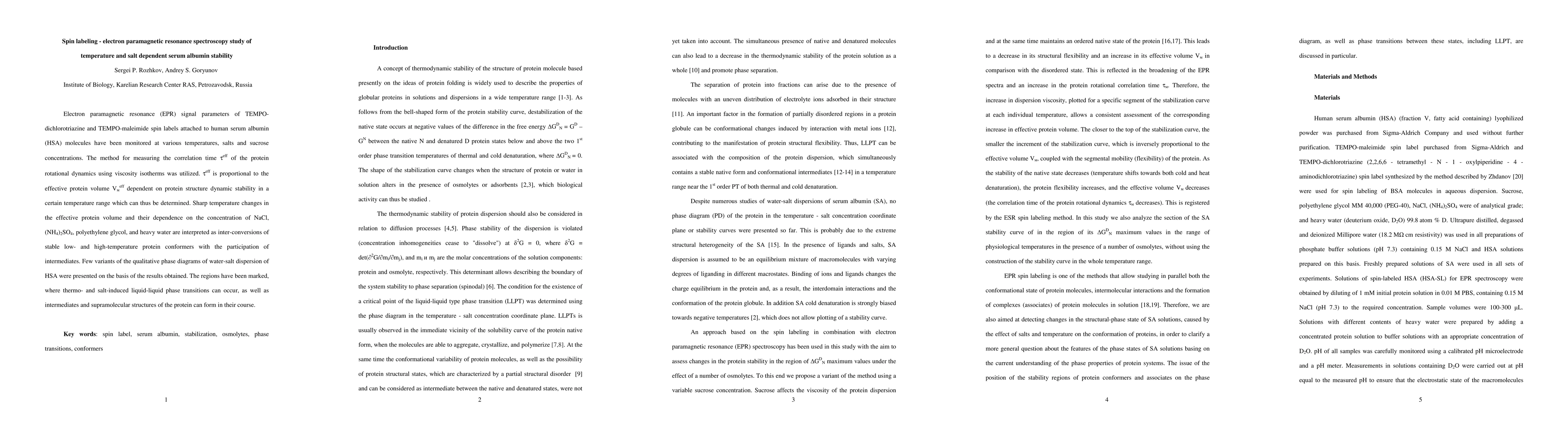 This study uses spin labeling and electron paramagnetic resonance spectroscopy to investigate the temperature and salt-dependent stability of human serum albumin. The research reveals how changes in effective protein volume correlate with structural dynamic stability, identifying regions where thermo and salt-induced phase transitions and protein intermediates form.
