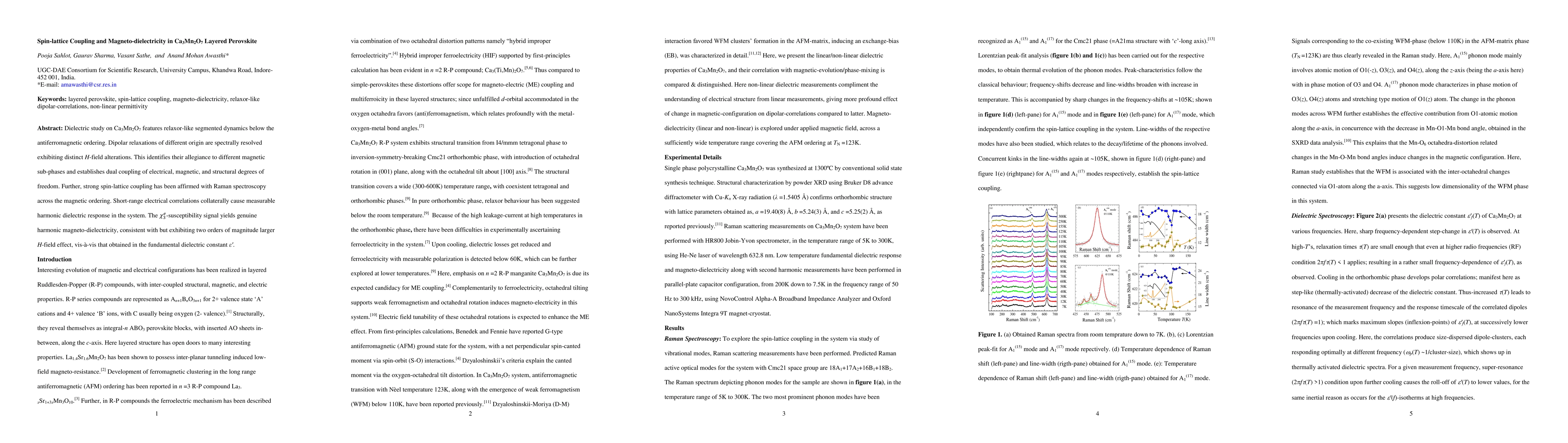 This study investigates the magneto-dielectric properties of Ca3Mn2O7 perovskite, revealing complex spin-lattice coupling and distinct magnetic sub-phases through spectrally resolved dipolar relaxations. The research confirms significant magneto-dielectric effects, with harmonic responses two orders of magnitude larger than typical dielectric constants.