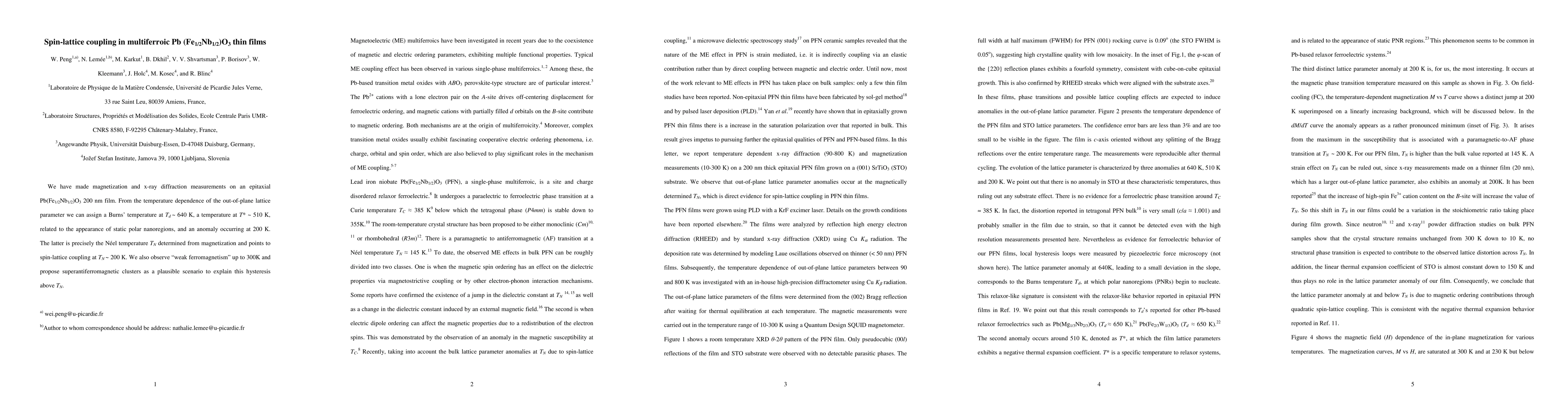 The study investigates Pb(Fe1/2Nb1/2)O3 thin films, revealing spin-lattice coupling at the Néel temperature TN of 200 K, along with evidence of "weak ferromagnetism" up to 300K, suggesting superantiferromagnetic clusters.