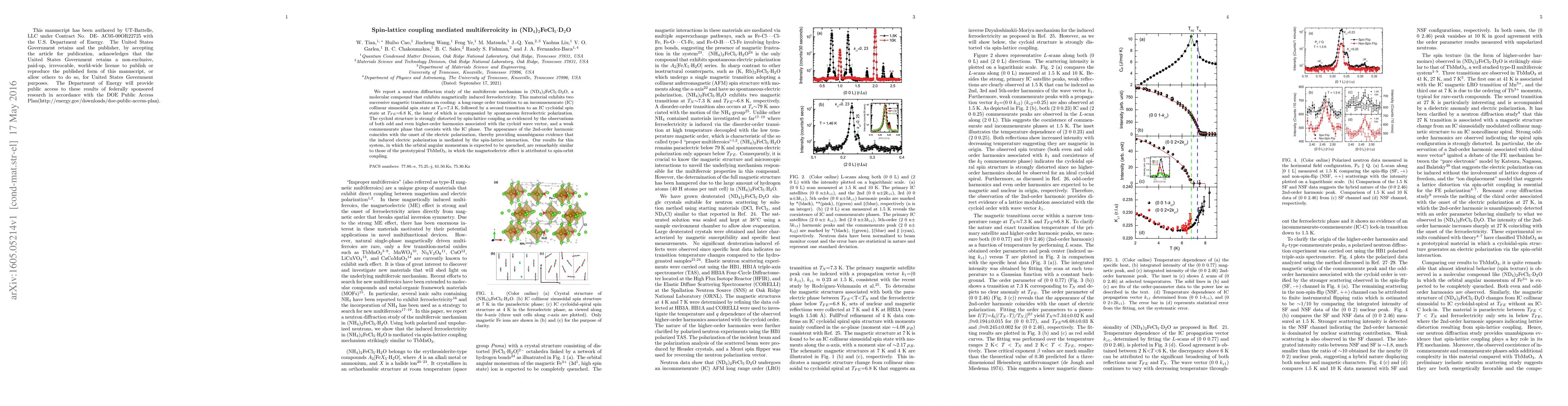 This study investigates the multiferroic mechanism in (ND4)2FeCl5D2O, revealing magnetically induced ferroelectricity via spin-lattice coupling. The compound undergoes magnetic transitions leading to cycloidal spin states, accompanied by spontaneous ferroelectric polarization, demonstrating the role of spin-lattice interactions in the magnetoelectric effect.