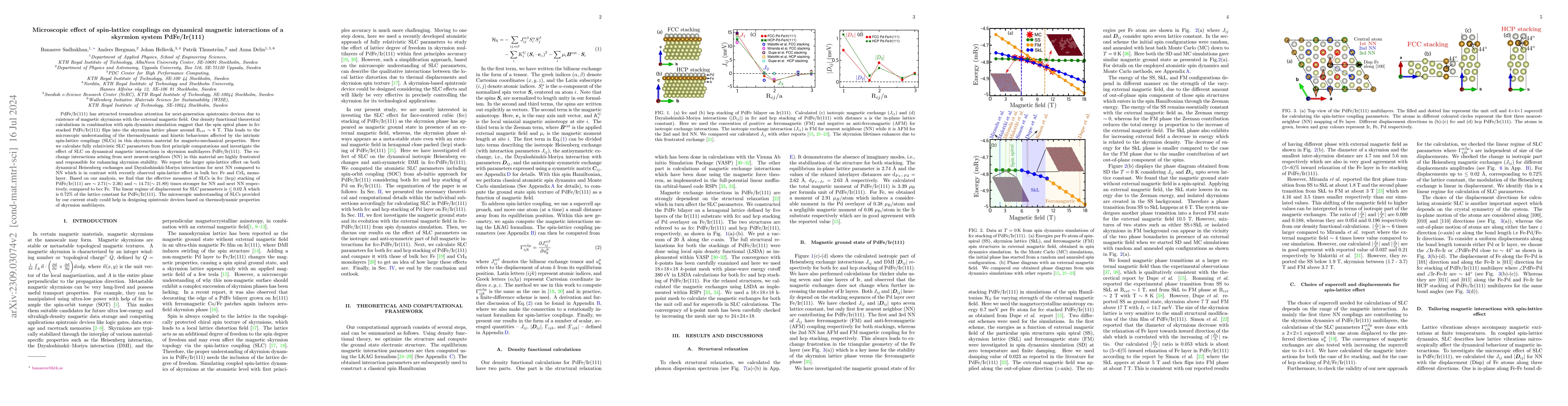 Pd-Fe/Ir(111) has attracted tremendous attention for next-generation spintronics devices due to existence of magnetic skyrmions with the external magnetic field. Our density functional theoretical calculations in combination with spin dynamics simulation suggest that the spin spiral phase in fcc stacked Pd-Fe/Ir(111) flips into the skyrmion lattice phase around B$_{ext} \sim$ 6 T. This leads to the microscopic understanding of the thermodynamic and kinetic behaviours affected by the intrinsic spin-lattice couplings (SLCs) in this skyrmion material for magneto-mechanical properties. Here we calculate fully relativistic SLC parameters from first principle computations and investigate the effect of SLC on dynamical magnetic interactions in skyrmion multilayers Pd-Fe/Ir(111). The exchange interactions arising from next nearest-neighbors (NN) in this material are highly frustrated and responsible for enhancing skyrmion stability. We report the larger spin-lattice effect on both dynamical Heisenberg exchanges and Dzyaloshinskii-Moriya interactions for next NN compared to NN which is in contrast with recently observed spin-lattice effect in bulk bcc Fe and CrI$_3$ monolayer. Based on our analysis, we find that the effective measures of SLCs in fcc (hcp) stacking of Pd-Fe/Ir(111) are $\sim 2.71 ( \sim 2.36)$ and $\sim 14.71 ( \sim21.89)$ times stronger for NN and next NN respectively, compared to bcc Fe. The linear regime of displacement for SLC parameters is $\leq$ 0.02 {\AA} which is 0.72\% of the lattice constant for Pd-FeIr(111). The microscopic understanding of SLCs provided by our current study could help in designing spintronic devices based on thermodynamic properties of skyrmion multilayers.