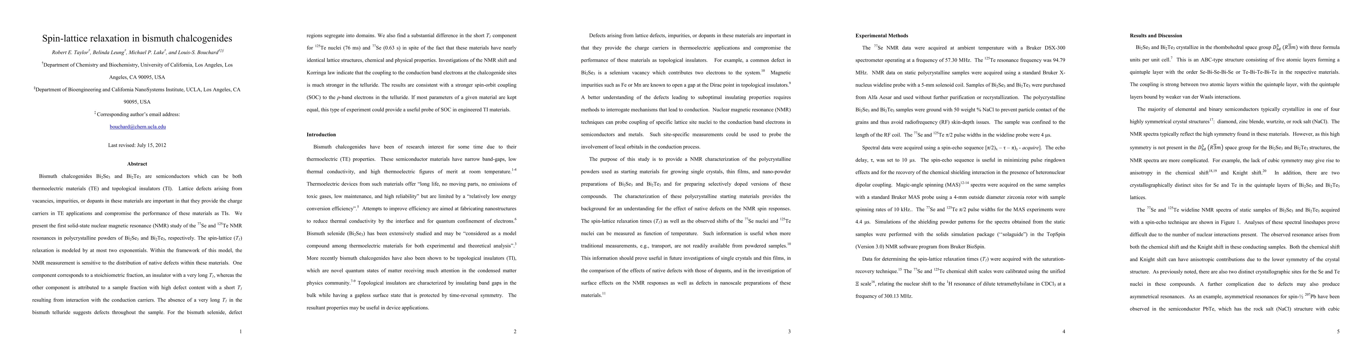 Bismuth chalcogenides Bi$_2$Se$_3$ and Bi$_2$Te$_3$ are semiconductors, which can be both thermoelectric materials (TE) and topological insulators (TI). Lattice defects arising from vacancies, impurities, or dopants in these materials are important in that they provide the charge carriers in TE applications and compromise the performance of these materials as TIs. We present the first solid-state nuclear magnetic resonance (NMR) study of the $^{77}$Se and $^{125}$Te NMR resonances in polycrystalline powders of Bi$_2$Se$_3$ and Bi$_2$Te$_3$, respectively. The spin-lattice ($T_1$) relaxation is modeled by at most two exponentials. Within the framework of this model, the NMR measurement is sensitive to the distribution of native defects within these materials. One component corresponds to a stoichiometric fraction, an insulator with a very long $T_1$, whereas the other component is attributed to a sample fraction with high defect content with a short $T_1$ resulting from interaction with the conduction carriers. The absence of a very long $T_1$ in the bismuth telluride suggests defects throughout the sample. For the bismuth selenide, defect regions segregate into domains. We also find a substantial difference in the short $T_1$ component for $^{125}$Te nuclei (76 ms) and $^{77}$Se (0.63 s) in spite of the fact that these materials have nearly identical lattice structures, chemical and physical properties. Investigations of the NMR shift and Korringa law indicate that the coupling to the conduction band electrons at the chalcogenide sites is much stronger in the telluride. The results are consistent with a stronger spin-orbit coupling (SOC) to the $p$-band electrons in the telluride. If most parameters of a given material are kept equal, this type of experiment could provide a useful probe of SOC in engineered TI materials.