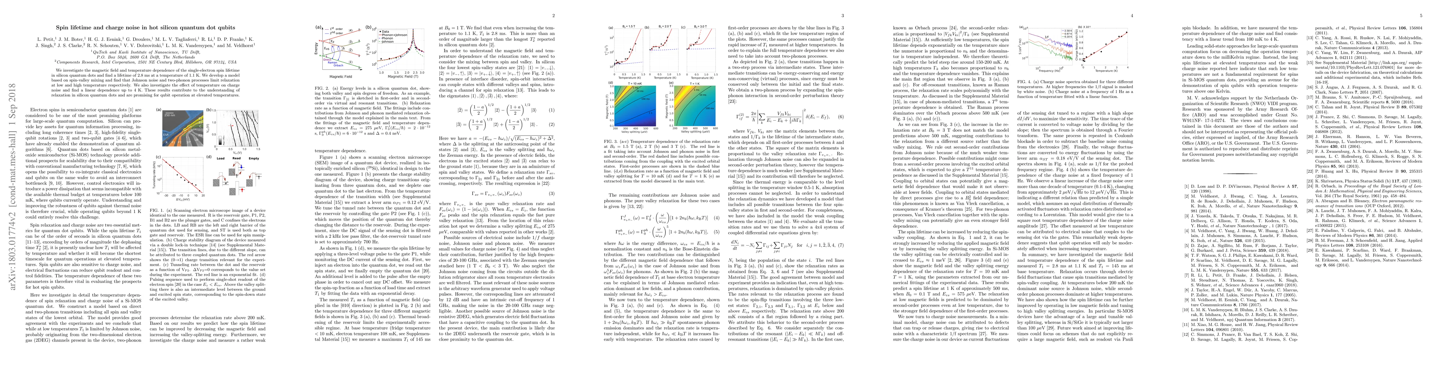 This study investigates the spin lifetime in silicon quantum dot qubits, revealing a 2.8 ms lifetime at 1.1 K, and identifies spin-valley mixing, Johnson noise, and two-phonon processes as key relaxation mechanisms. It also finds a linear relationship between charge noise and temperature up to 4 K, enhancing the understanding of qubit operation at higher temperatures.