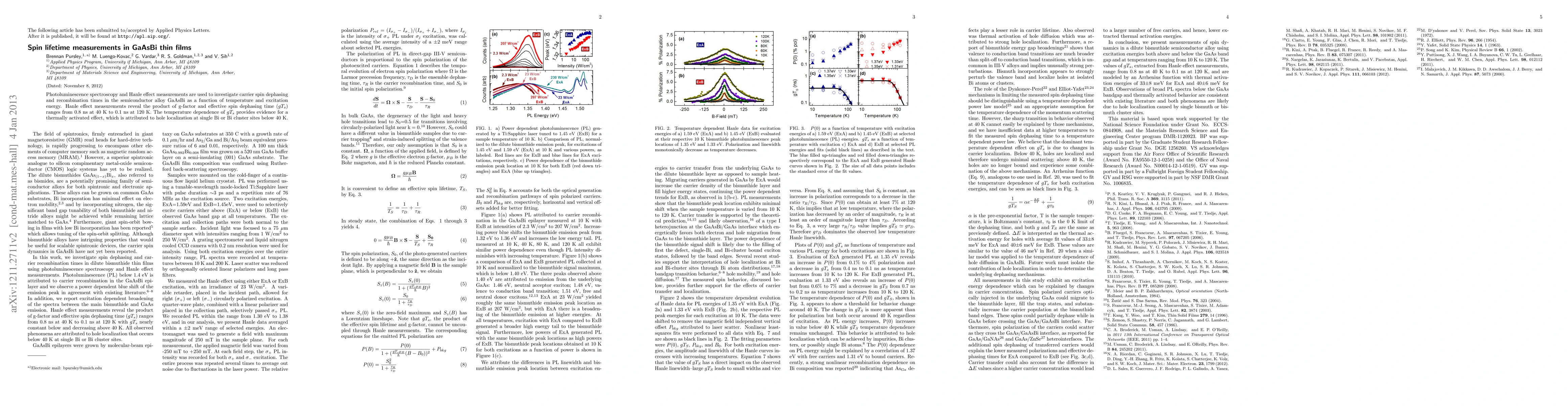 This study uses photoluminescence and Hanle effect measurements to analyze spin dephasing and recombination in GaAsBi thin films, finding that the g-factor times spin dephasing time (gTs) decreases from 0.8 ns at 40 K to 0.1 ns at 120 K, indicating a thermally activated effect due to hole localization at Bi sites.