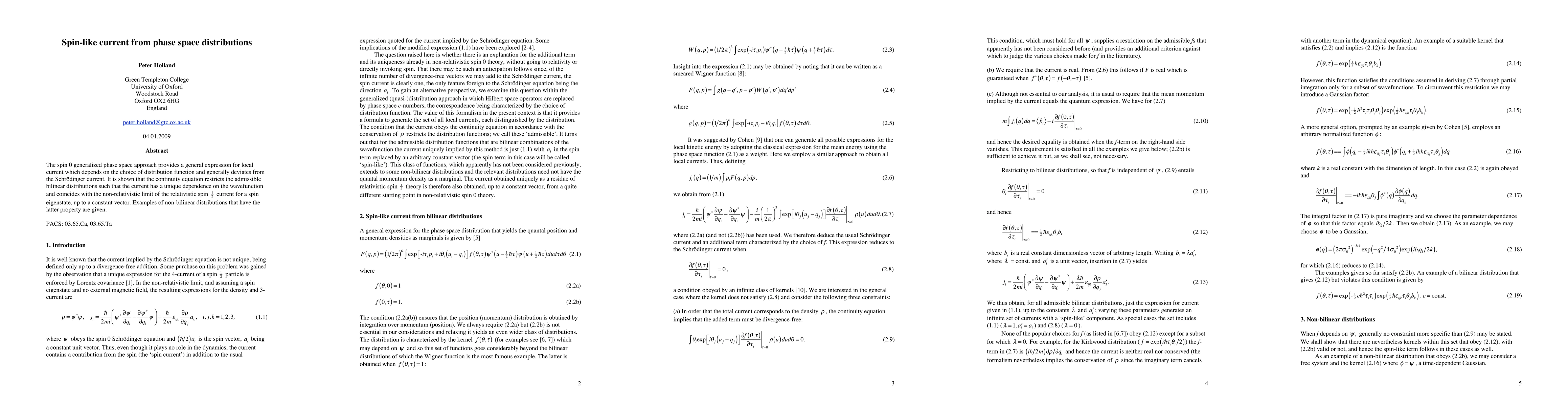 The spin 0 generalized phase space approach provides a general expression for local current which depends on the choice of distribution function and generally deviates from the Schrodinger current. It is shown that the continuity equation restricts the admissible bilinear distributions such that the current has a unique dependence on the wavefunction and coincides with the non-relativistic limit of the relativistic spin 1/2 current for a spin eigenstate, up to a constant vector. Examples of non-bilinear distributions that have the latter property are given.