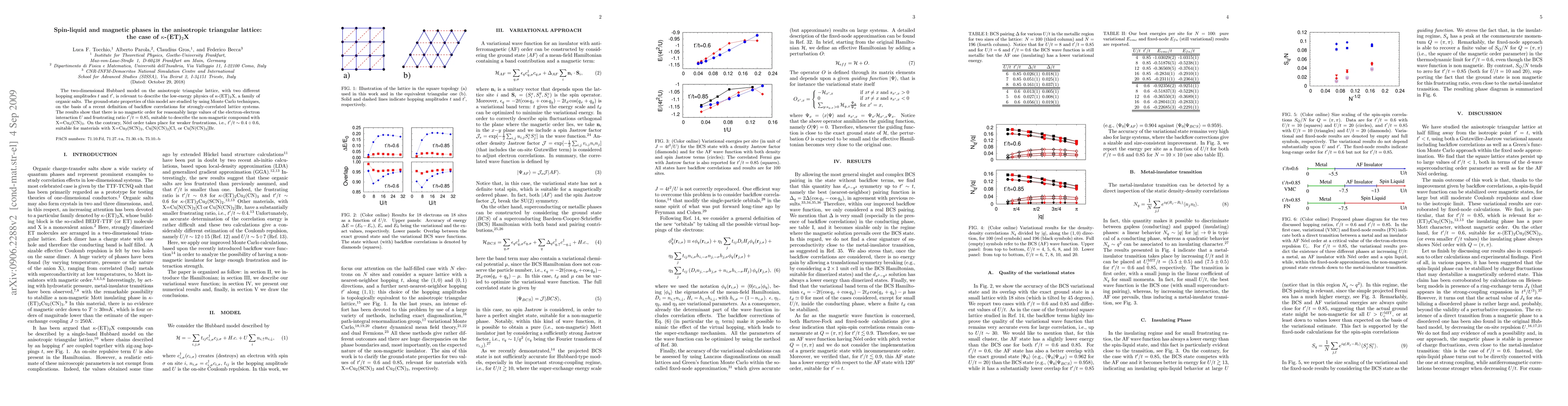 The two-dimensional Hubbard model on the anisotropic triangular lattice, with two different hopping amplitudes $t$ and $t^\prime$, is relevant to describe the low-energy physics of $\kappa$-(ET)$_2$X, a family of organic salts. The ground-state properties of this model are studied by using Monte Carlo techniques, on the basis of a recent definition of backflow correlations for strongly-correlated lattice systems. The results show that there is no magnetic order for reasonably large values of the electron-electron interaction $U$ and frustrating ratio $t^\prime/t = 0.85$, suitable to describe the non-magnetic compound with X=Cu$_2$(CN)$_3$. On the contrary, N\'eel order takes place for weaker frustrations, i.e., $t^\prime/t \sim 0.4 \div 0.6$, suitable for materials with X=Cu$_2$(SCN)$_2$, Cu[N(CN)$_2$]Cl, or Cu[N(CN)$_2$]Br.