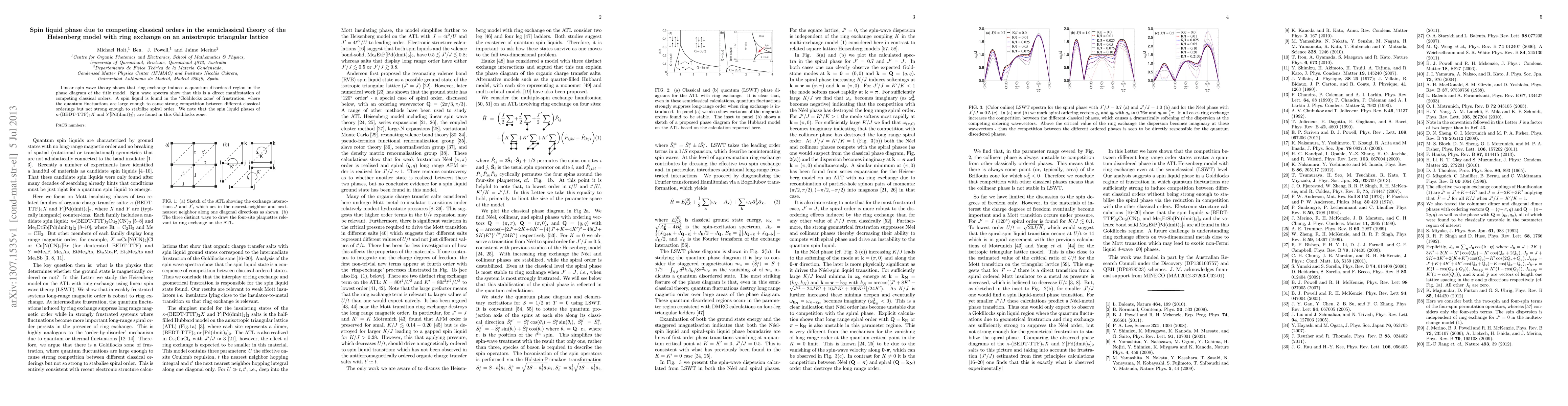 Linear spin wave theory shows that ring exchange induces a quantum disordered region in the phase diagram of the title model. Spin wave spectra show that this is a direct manifestation of competing classical orders. A spin liquid is found in the `Goldilocks zone' of frustration, where the quantum fluctuations are large enough to cause strong competition between different classical orderings but not strong enough to stabilize spiral order. We note that the spin liquid phases of $\kappa$-(BEDT-TTF)${_2}X$ and $Y$[Pd(dmit)$_2$]$_2$ are found in this Goldilocks zone.