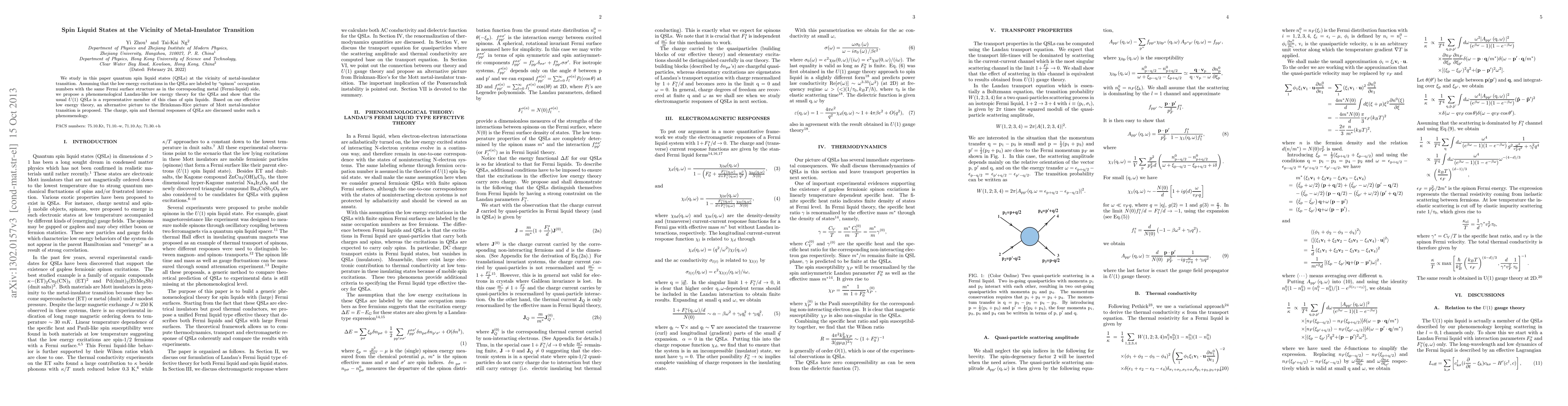We study in this paper quantum spin liquid states (QSLs) at the vicinity of metal-insulator transition. Assuming that the low energy excitations in the QSLs are labeled by "spinon" occupation numbers with the same Fermi surface structure as in the corresponding metal (Fermi-liquid) side, we propose a phenomenological Landau-like low energy theory for the QSLs and show that the usual U(1) QSLs is a representative member of this class of spin liquids. Based on our effective low energy theory, an alternative picture to the Brinkman-Rice picture of Mott metal-insulator transition is proposed. The charge, spin and thermal responses of QSLs are discussed under such a phenomenology.