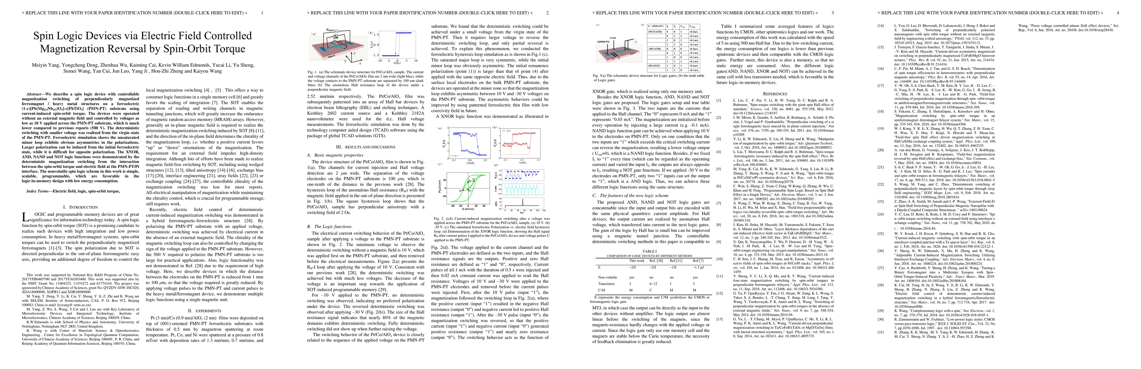 This paper presents a spin logic device utilizing electric field-controlled magnetization reversal via spin-orbit torque, operating at significantly lower voltages (10 V) compared to previous methods (500 V). The device demonstrates nonvolatile logic functions on a ferroelectric substrate, showcasing scalability and low energy consumption.