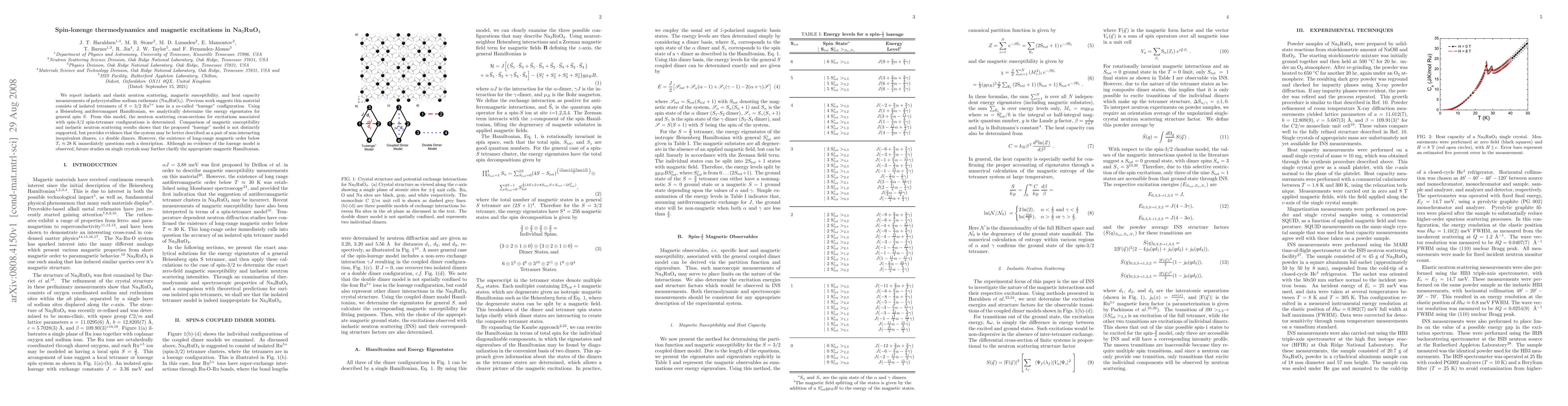 We report inelastic and elastic neutron scattering, magnetic susceptibility, and heat capacity measurements of polycrystalline sodium ruthenate (Na$_3$RuO$_4$). Previous work suggests this material consists of isolated tetramers of $S=3/2$ Ru$^{5+}$ ions in a so-called "lozenge" configuration. Using a Heisenberg antiferromagnet Hamiltonian, we analytically determine the energy eigenstates for general spin $S$. From this model, the neutron scattering cross-sections for excitations associated with spin-3/2 spin-tetramer configurations is determined. Comparison of magnetic susceptibility and inelastic neutron scattering results shows that the proposed "lozenge" model is not distinctly supported, but provides evidence that the system may be better described as a pair of non-interacting inequivalent dimers, \textit{i.e} double dimers. However, the existence of long-range magnetic order below $T_c \approx 28$ K immediately questions such a description. Although no evidence of the lozenge model is observed, future studies on single crystals may further clarify the appropriate magnetic Hamiltonian.