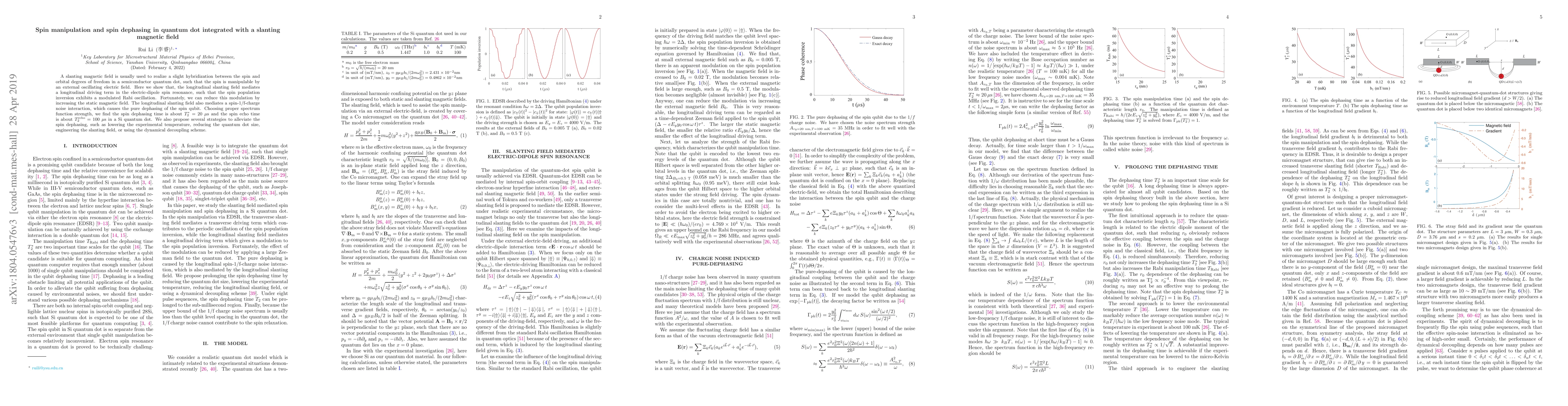 This paper investigates spin manipulation and dephasing in a semiconductor quantum dot under a slanting magnetic field, demonstrating that it enables hybridized spin-orbital control via electric fields. It shows that while this field enhances spin resonance, it also introduces spin dephasing due to 1/f-charge noise interactions, proposing methods to improve spin coherence times through temperature reduction, quantum dot size minimization, and dynamical decoupling.