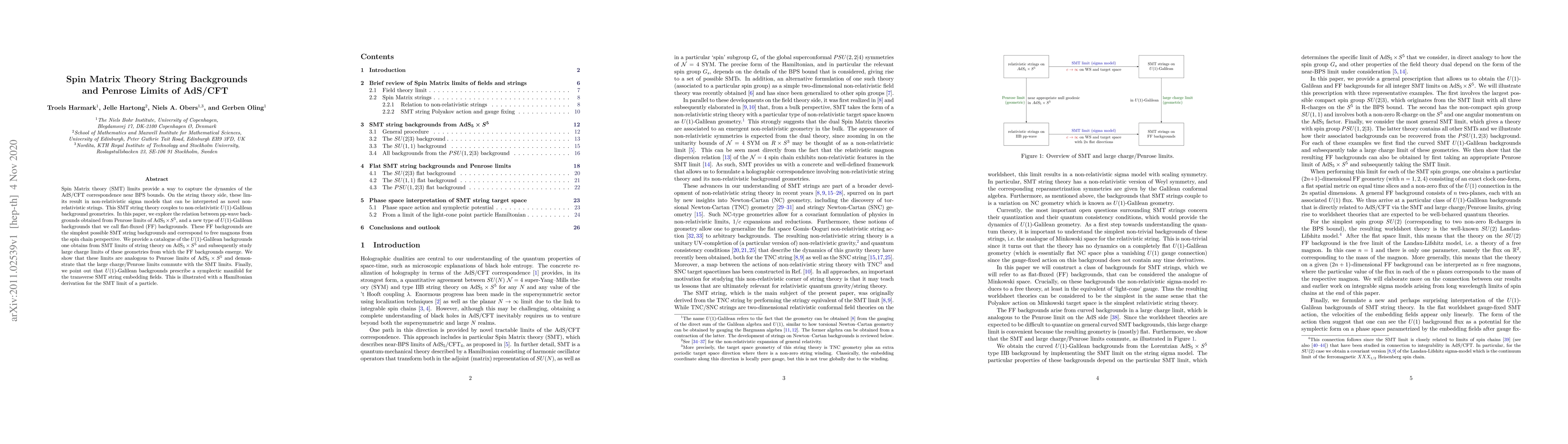 Spin Matrix theory (SMT) limits provide a way to capture the dynamics of the AdS/CFT correspondence near BPS bounds. On the string theory side, these limits result in non-relativistic sigma models that can be interpreted as novel non-relativistic strings. This SMT string theory couples to non-relativistic $U(1)$-Galilean background geometries. In this paper, we explore the relation between pp-wave backgrounds obtained from Penrose limits of AdS${}_5 \times S^5$, and a new type of $U(1)$-Galilean backgrounds that we call flat-fluxed (FF) backgrounds. These FF backgrounds are the simplest possible SMT string backgrounds and correspond to free magnons from the spin chain perspective. We provide a catalogue of the $U(1)$-Galilean backgrounds one obtains from SMT limits of string theory on AdS${}_5 \times S^5$ and subsequently study large charge limits of these geometries from which the FF backgrounds emerge. We show that these limits are analogous to Penrose limits of AdS${}_5 \times S^5$ and demonstrate that the large charge/Penrose limits commute with the SMT limits. Finally, we point out that $U(1)$-Galilean backgrounds prescribe a symplectic manifold for the transverse SMT string embedding fields. This is illustrated with a Hamiltonian derivation for the SMT limit of a particle.