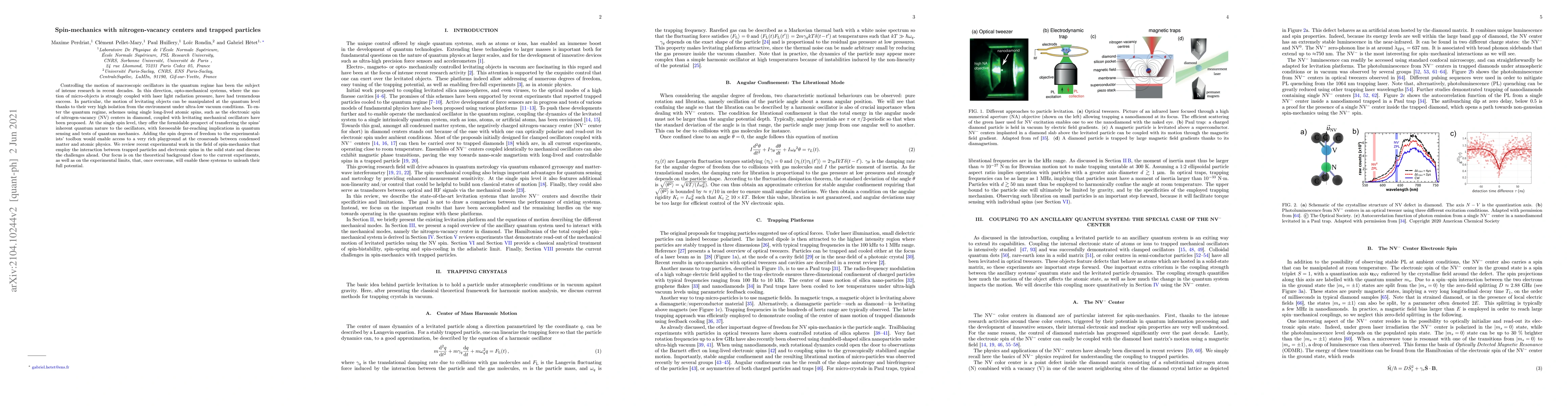 Controlling the motion of macroscopic oscillators in the quantum regime has been the subject of intense research in recent decades. In this direction, opto-mechanical systems, where the motion of micro-objects is strongly coupled with laser light radiation pressure, have had tremendous success. In particular, the motion of levitating objects can be manipulated at the quantum level thanks to their very high isolation from the environment under ultra-low vacuum conditions. To enter the quantum regime, schemes using single long-lived atomic spins, such as the electronic spin of nitrogen-vacancy (NV) centers in diamond, coupled with levitating mechanical oscillators have been proposed. At the single spin level, they offer the formidable prospect of transferring the spins' inherent quantum nature to the oscillators, with foreseeable far-reaching implications in quantum sensing and tests of quantum mechanics. Adding the spin degrees of freedom to the experimentalists' toolbox would enable access to a very rich playground at the crossroads between condensed matter and atomic physics. We review recent experimental work in the field of spin-mechanics that employ the interaction between trapped particles and electronic spins in the solid state and discuss the challenges ahead. Our focus is on the theoretical background close to the current experiments, as well as on the experimental limits, that, once overcome, will enable these systems to unleash their full potential.