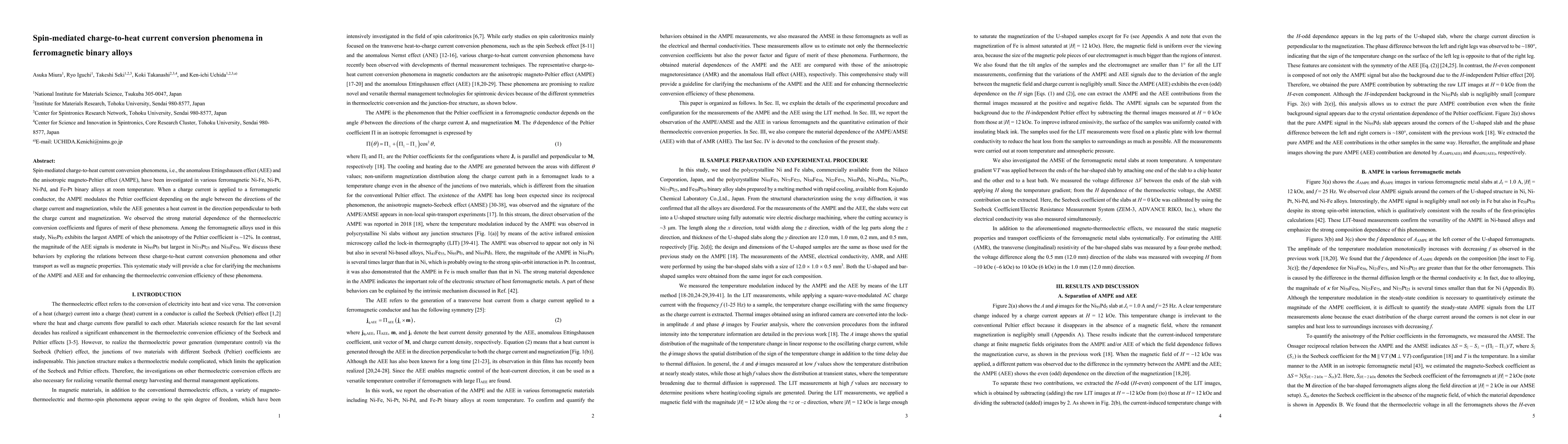 This paper investigates spin-mediated charge-to-heat current conversion phenomena in ferromagnetic binary alloys, specifically the anomalous Ettingshausen effect and anisotropic magneto-Peltier effect, revealing strong material dependence in these phenomena. Ni$_{95}$Pt$_{5}$ shows the largest anisotropic magneto-Peltier effect, while Ni$_{75}$Pt$_{25}$ and Ni$_{50}$Fe$_{50}$ exhibit the largest anomalous Ettingshausen effect.